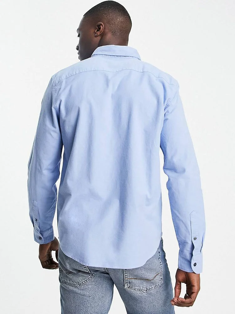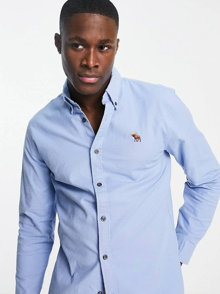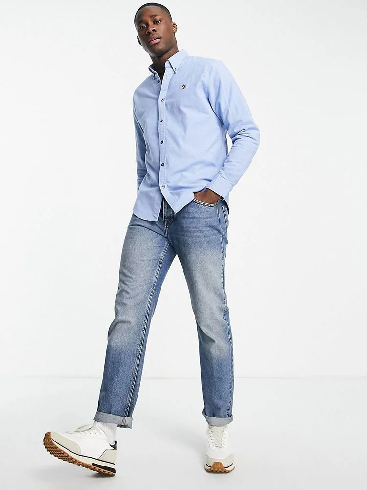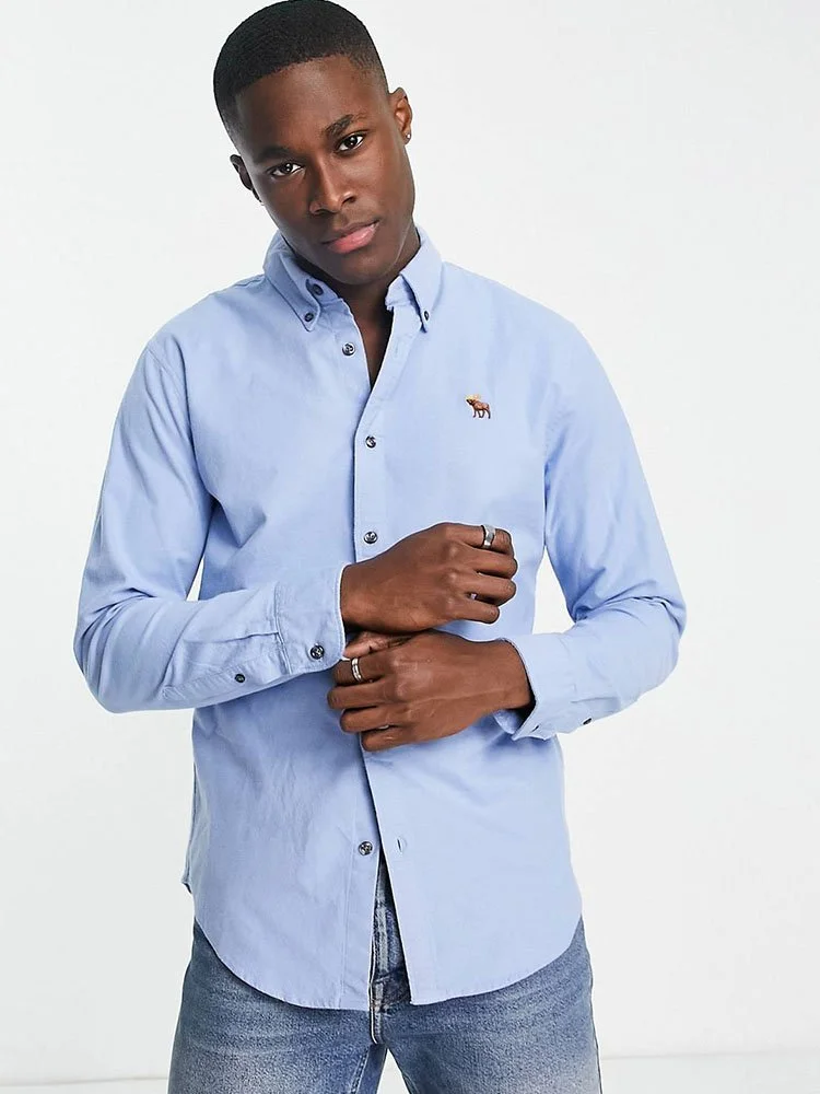 Camisa oxford clásica abotonada con ícono de logo multicolor bordado en el lado izquierdo del pecho, cuello abotonado y dobladillo redondeado.