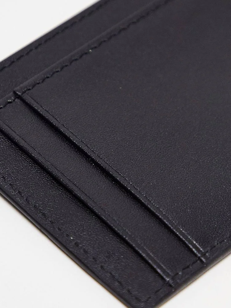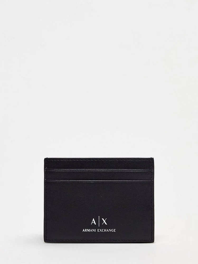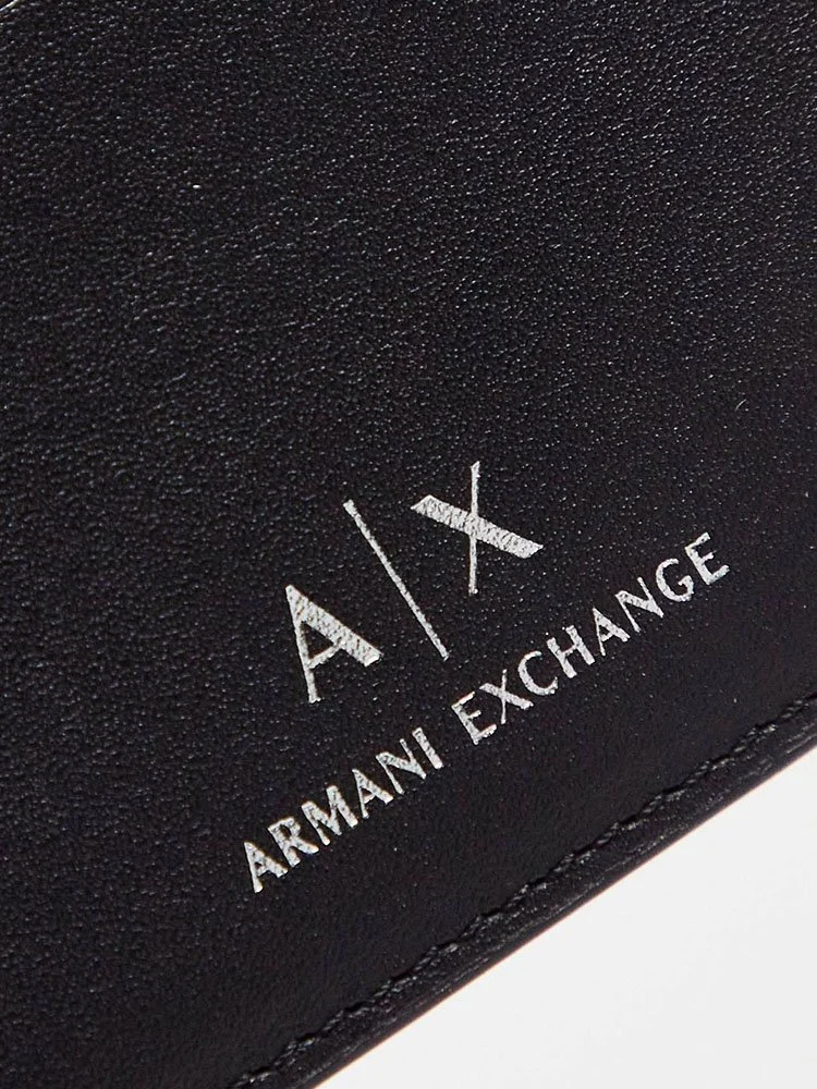 Tarjetero de cuero de la marca Armani Exchange con múltiples compartimentos para tarjetas y detalle de logo estampado.