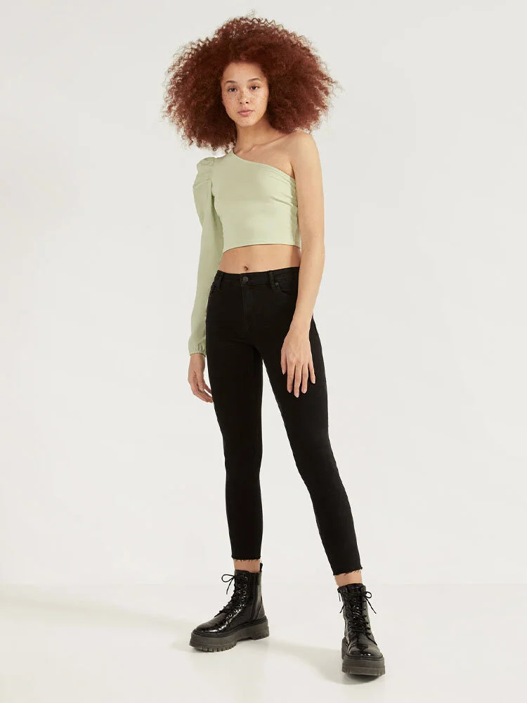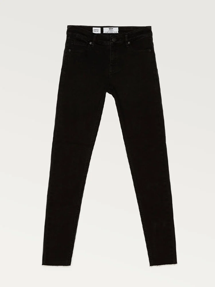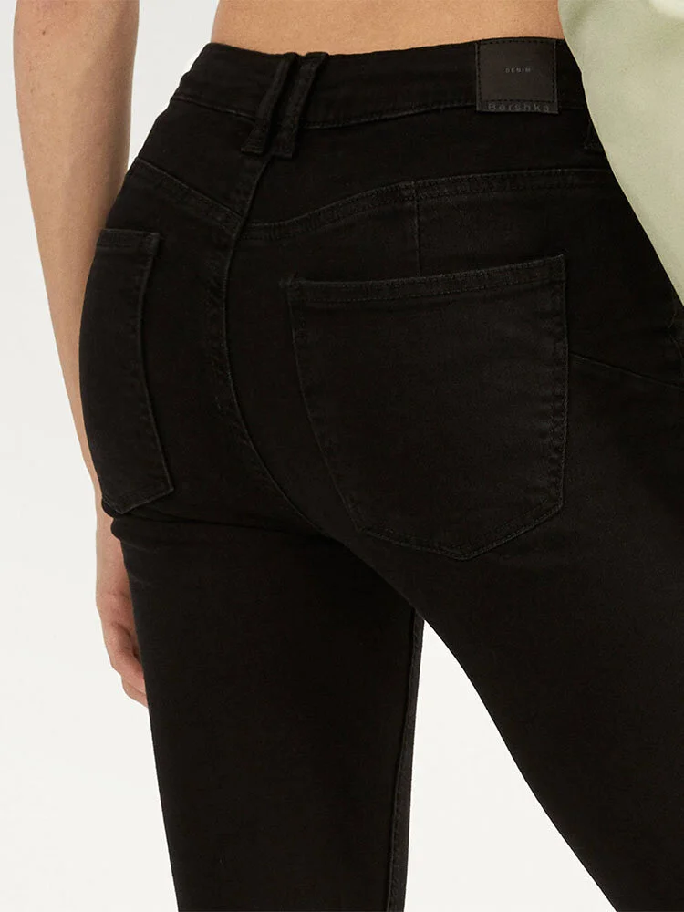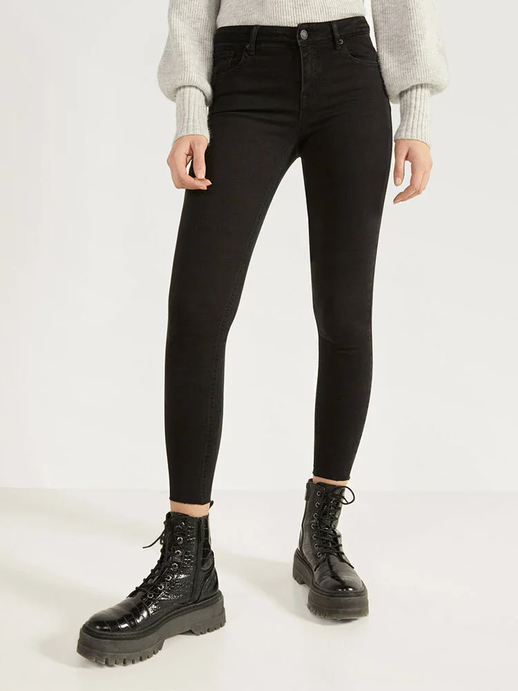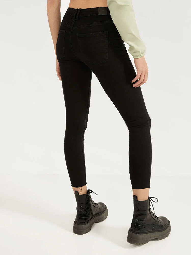 Jeans Skinny con pinzas en la espalda para un efecto push-up Tiro alto Trabillas para el cinturón Bragueta con cierre Cinco bolsillos Dobladillo sin rematar Corte ajustado Corte ajustado, regular en la cintura.