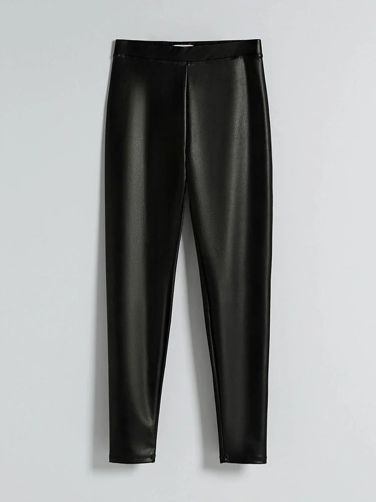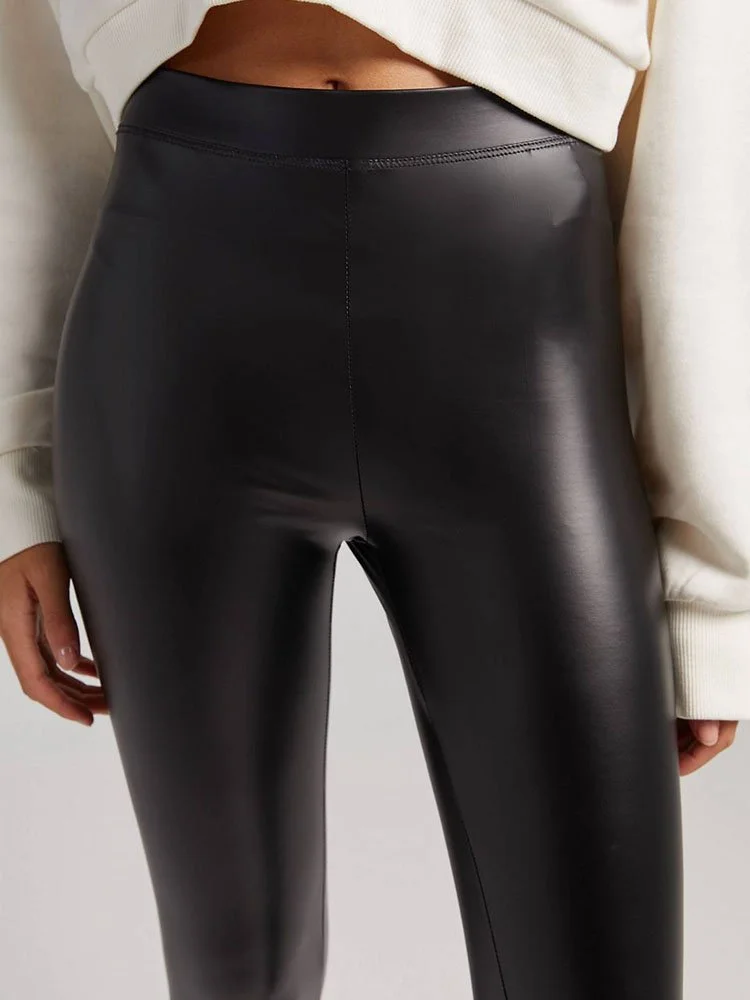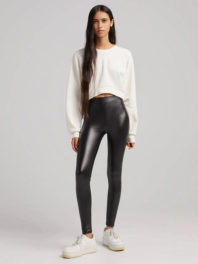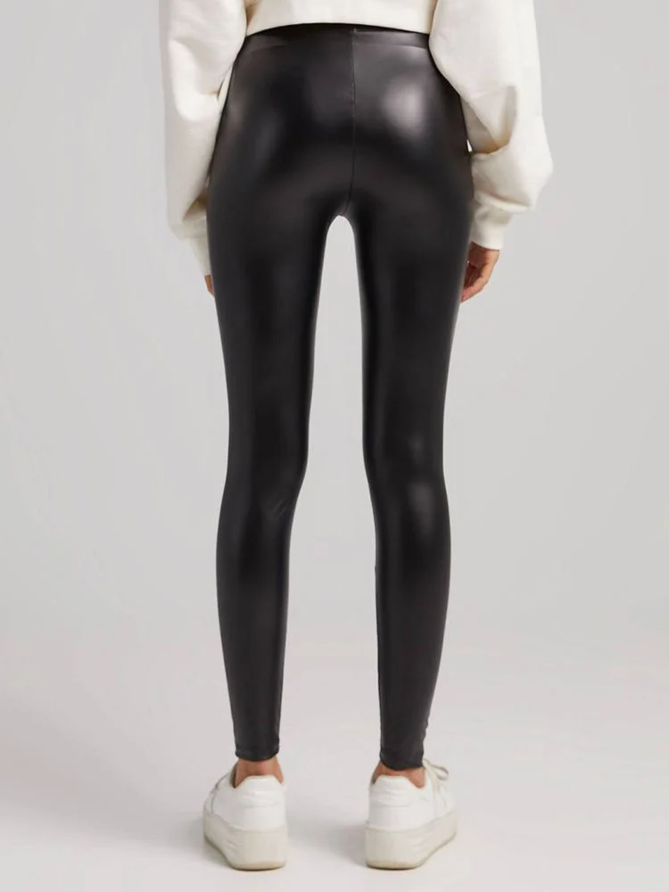 Leggings elaborado en cuerina de la marca Bershka con tiro alto, cintura elástica y ajuste ceñido al cuerpo.