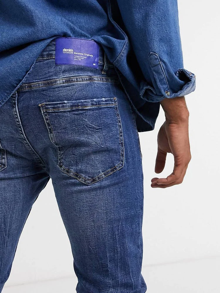 Skinny jeans de la marca Bershka, con talle normal, trabillas, cinco bolsillos y corte pitillo.