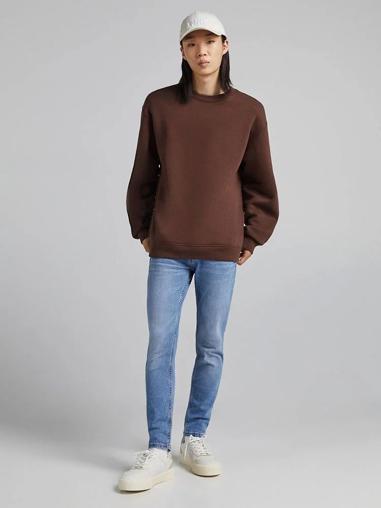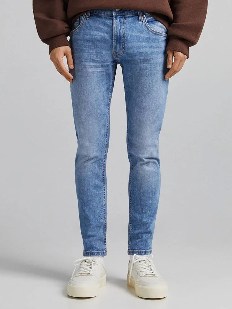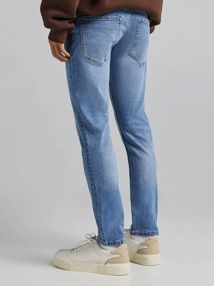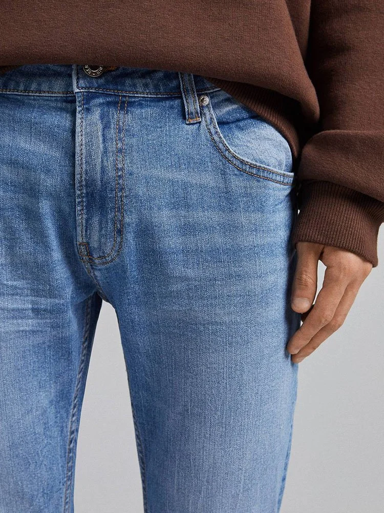 Jeans de la marca Bershka en acabado desgastado con tiro regular, trabillas, bragueta con cierre y cinco bolsillos.