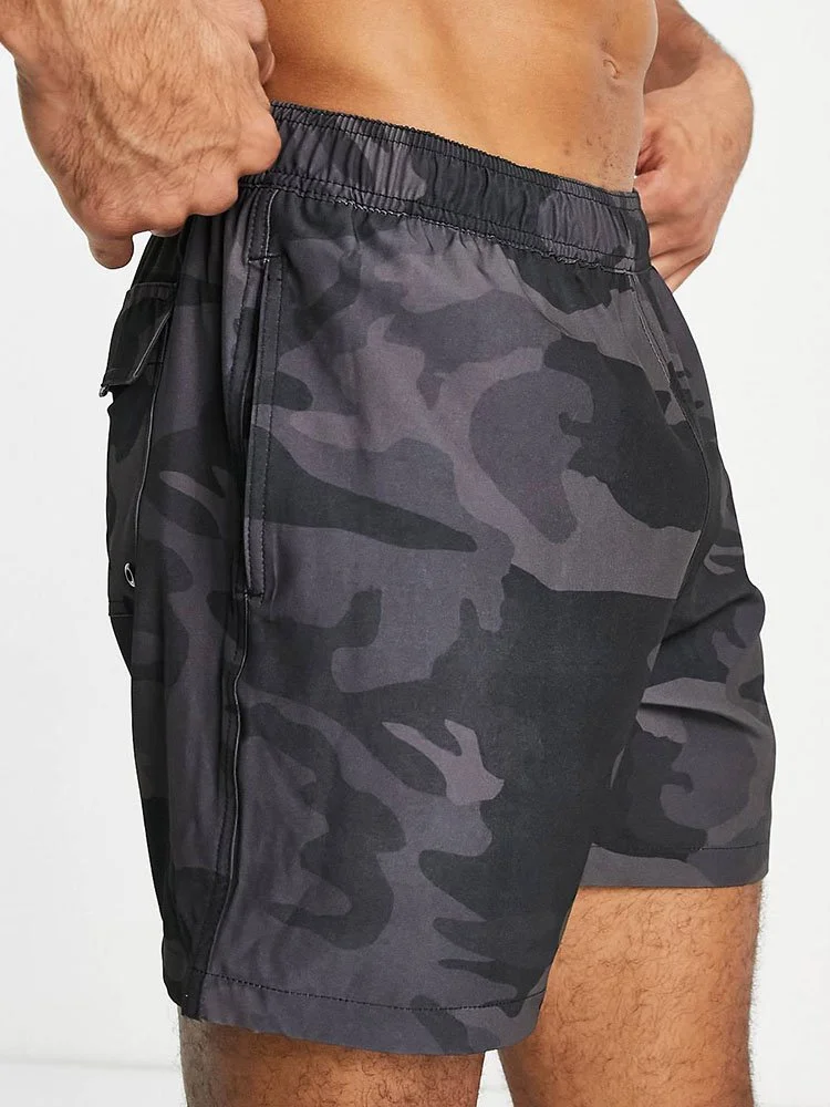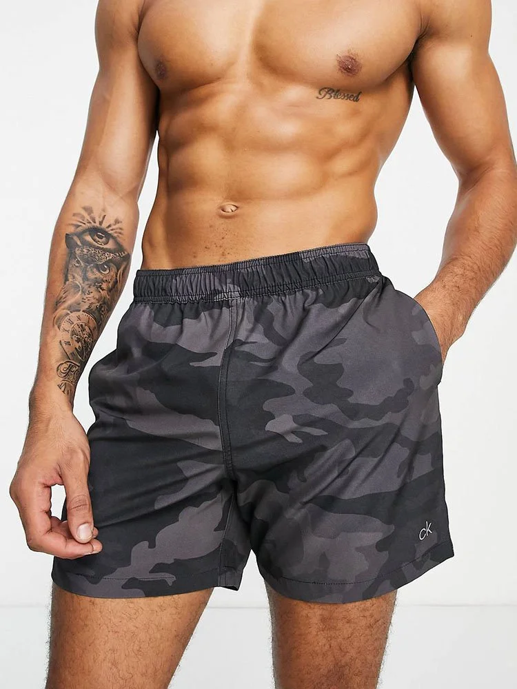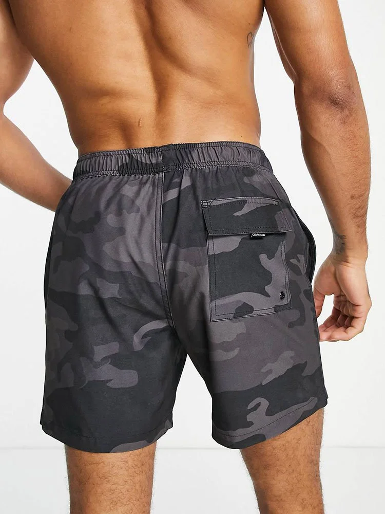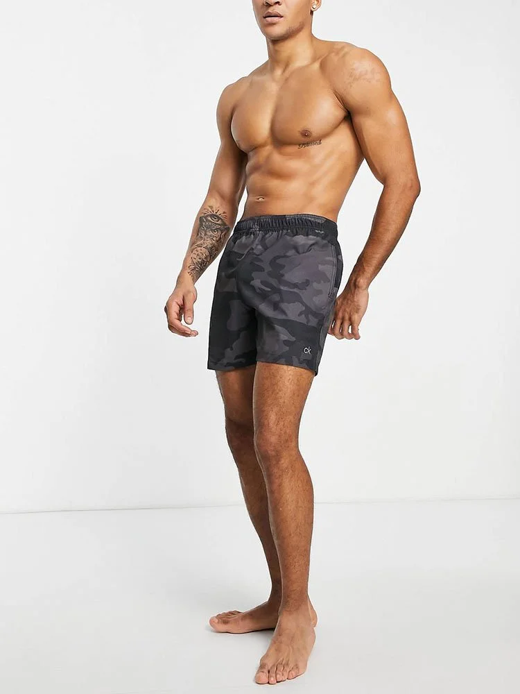 Shorts de baño de la marca Calvin Klein con cintura elástica, bolsillos laterales, bolsillo trasero único con drenaje de ojal y logo estampado.