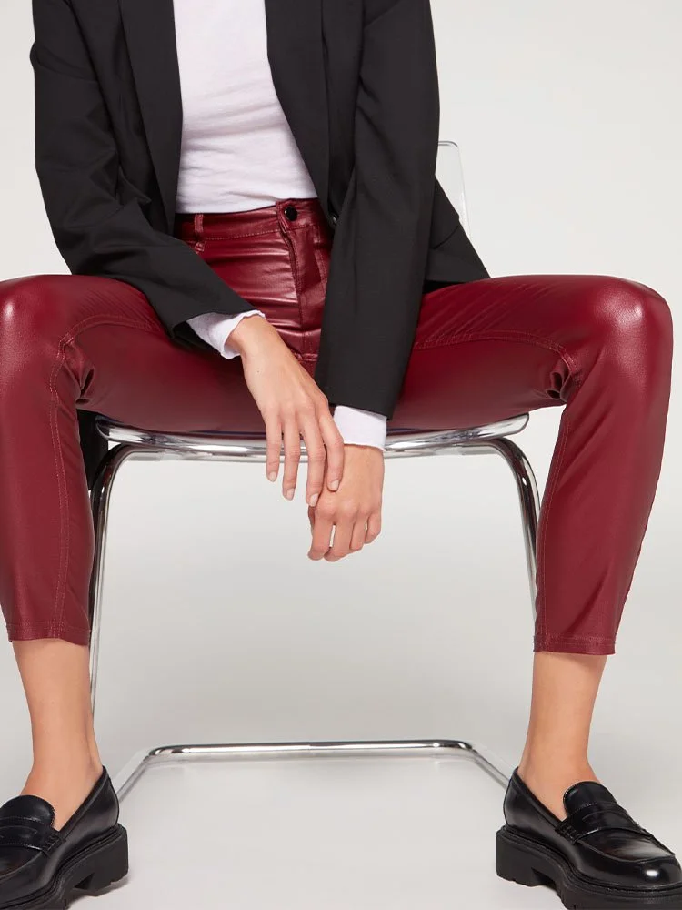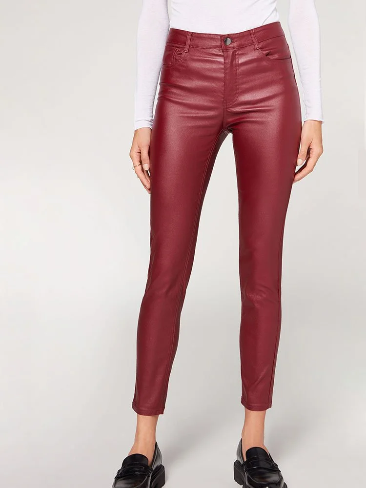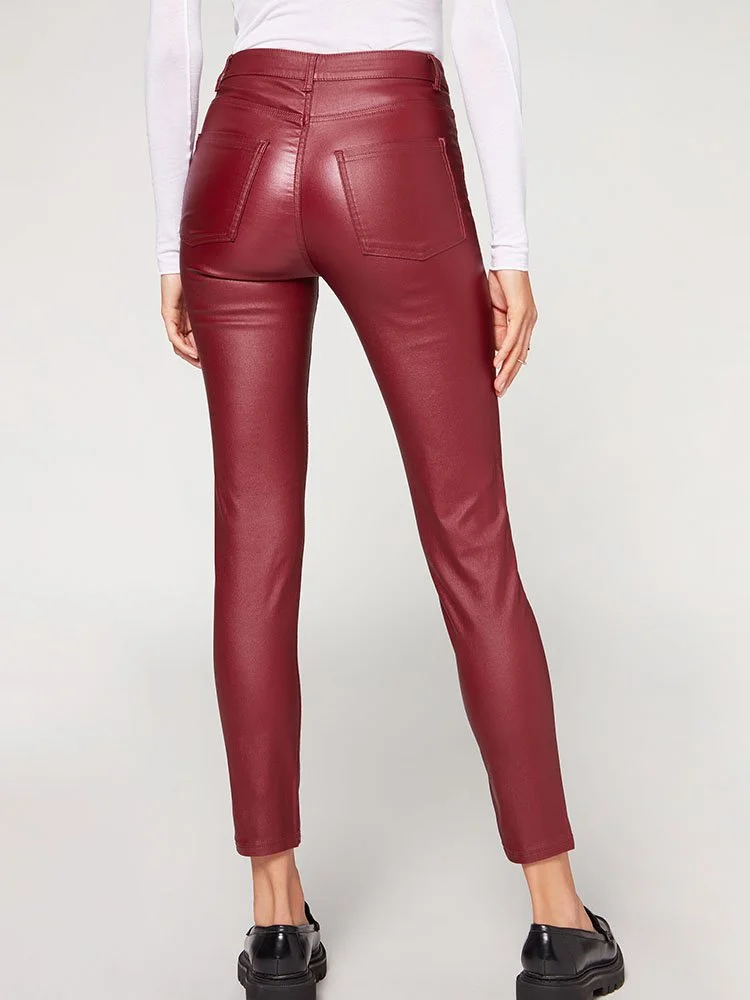 Leggings efecto piel 5 bolsillos con bolsillos delanteros y traseros auténticos. Cierre con cremallera y botón. Corte skinny.