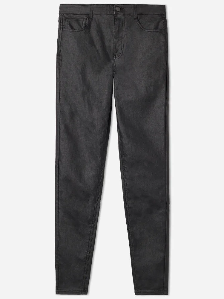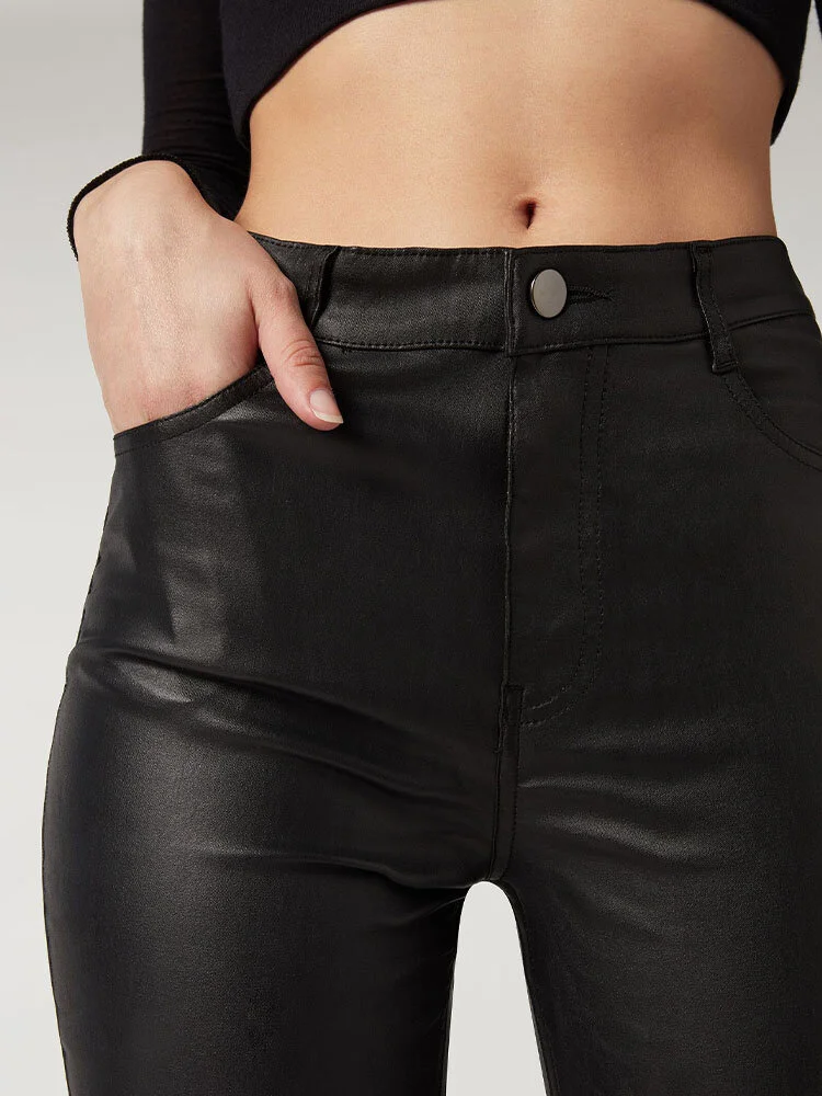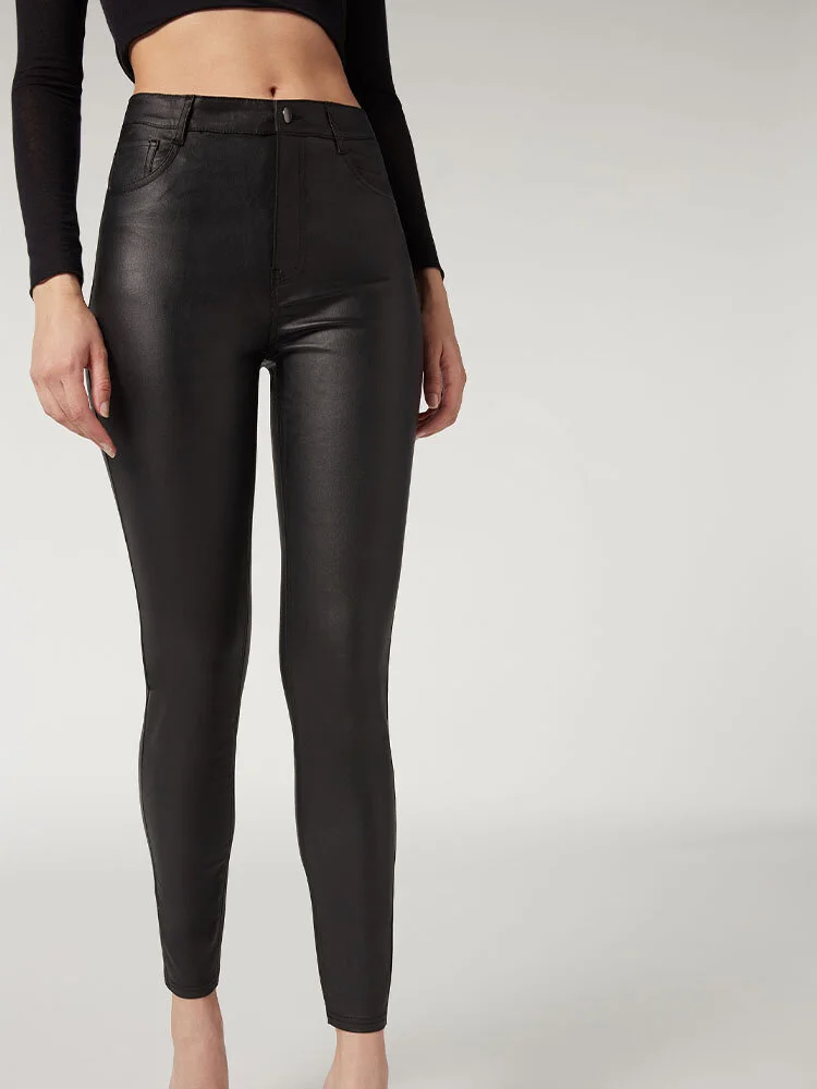 Leggings de cuerina de 5 bolsillos, con bolsillos delanteros y traseros auténticos. Cierre con cremallera y botón. Corte skinny.