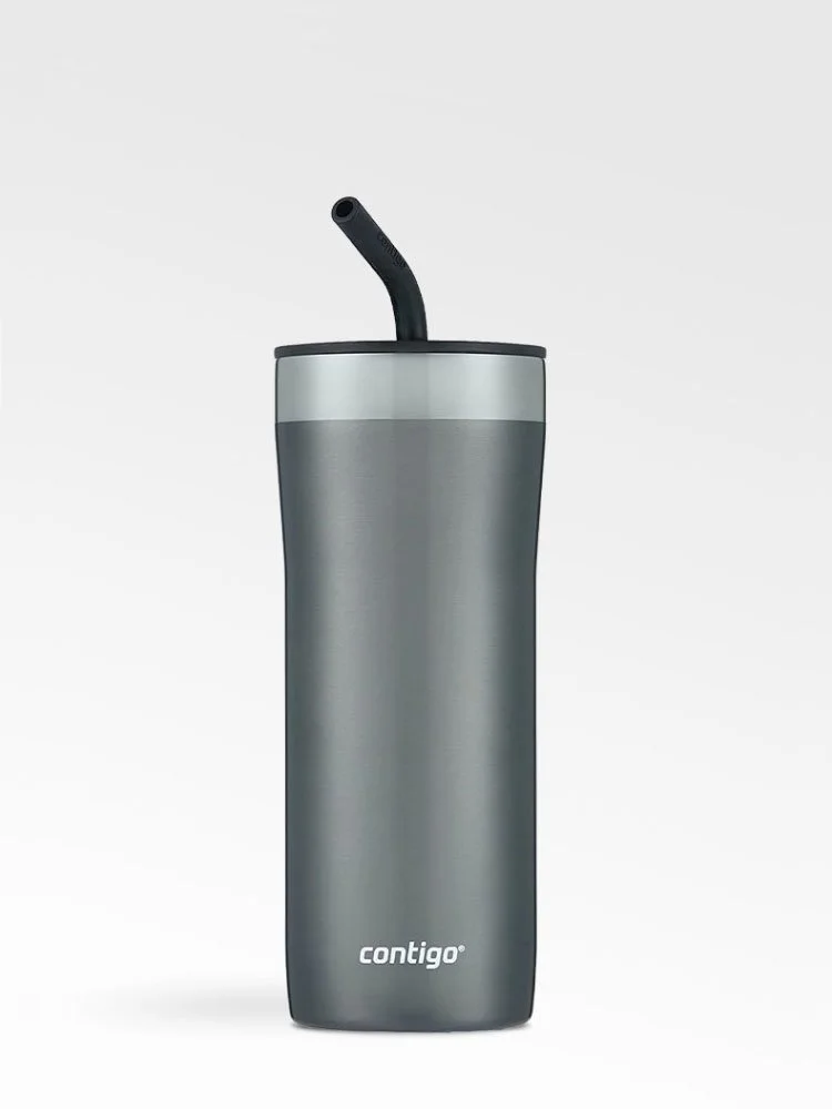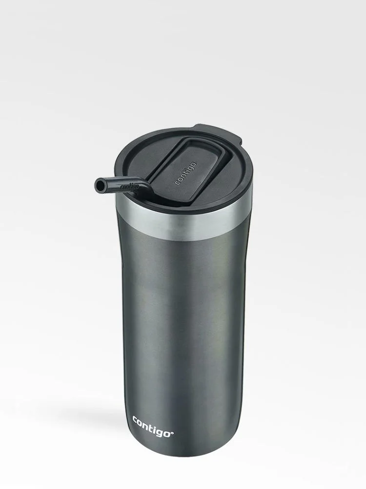 Bebe café caliente mientras trabajas desde casa o disfruta de una bebida helada a través del pitillo mientras caminas con el vaso Contigo de acero inoxidable aislado al vacío con pitillo flexible de acero inoxidable y tapa deslizante a prueba de salpicaduras.