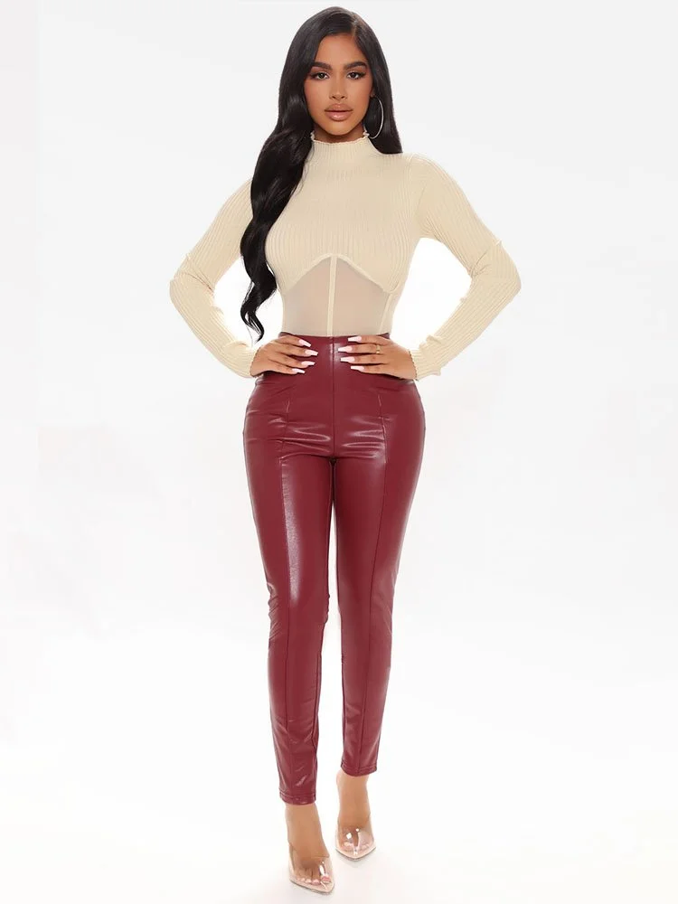 Leggings elaborado en cuerina de cintura alta, detalles de costuras y cintura elástica.