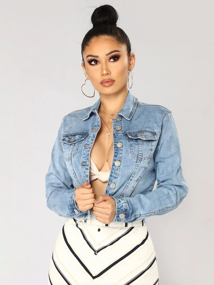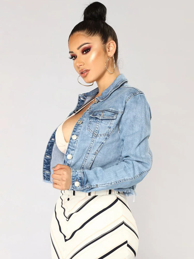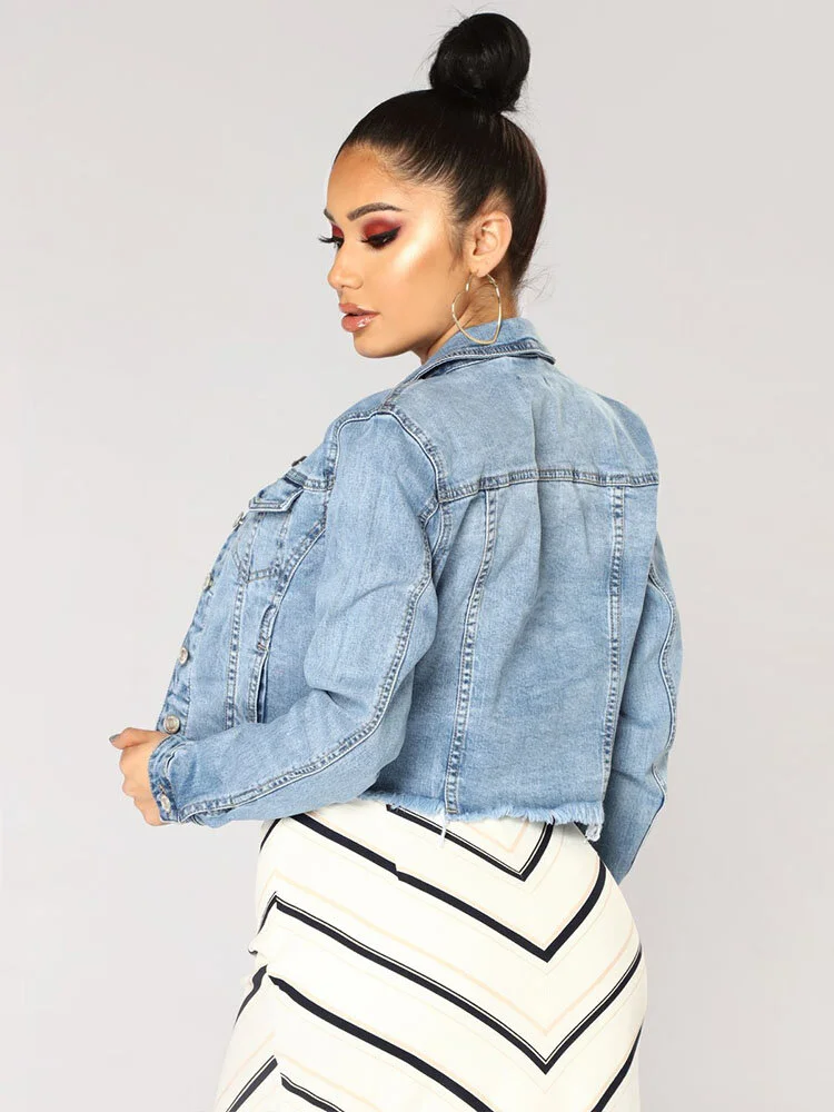 Chaqueta de jeans corta con lavado ligero, dobladillo sin rematar, bolsillos laterales y en la parte del pecho.
