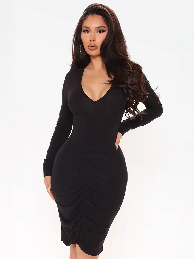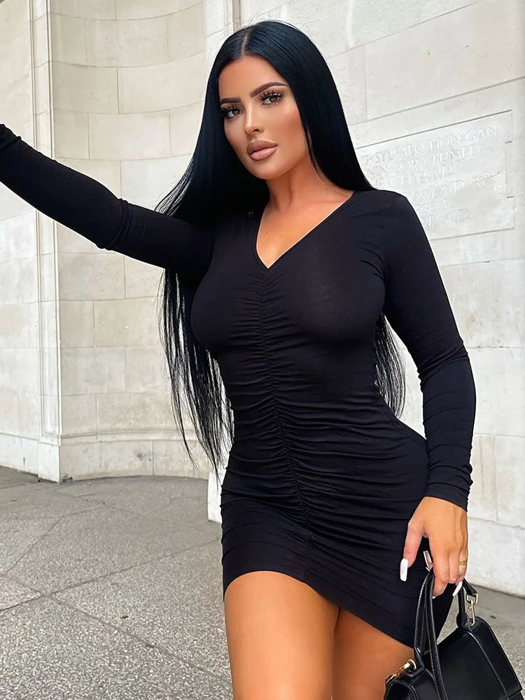 Mini vestido fruncido al cuerpo con escote en pico y manga larga.