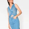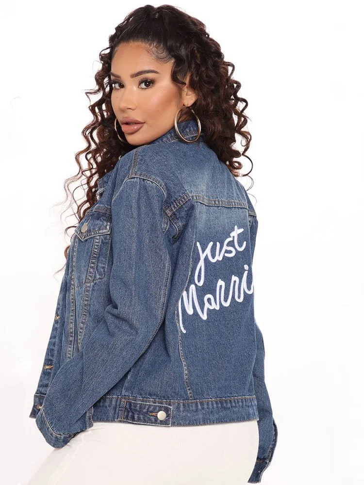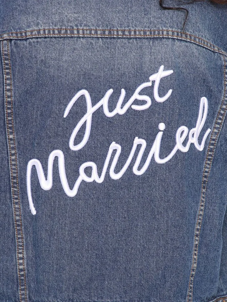 Chaqueta de jeans con bordado de frase “Just Married” en la espalda.
