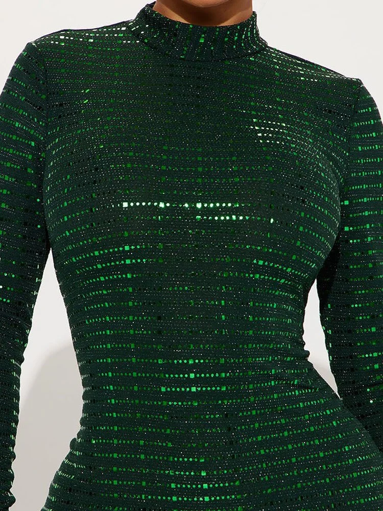 Minivestido ceñido con purpurina, manga larga, escote simulado, espalda abierta y cierre de botón.