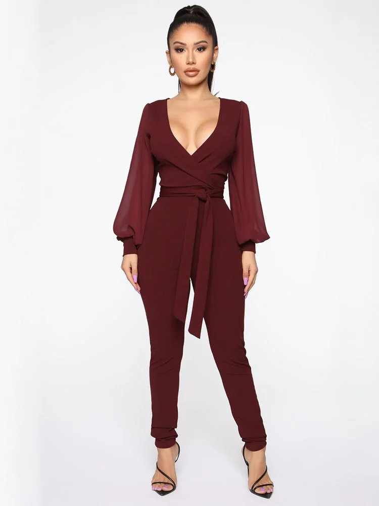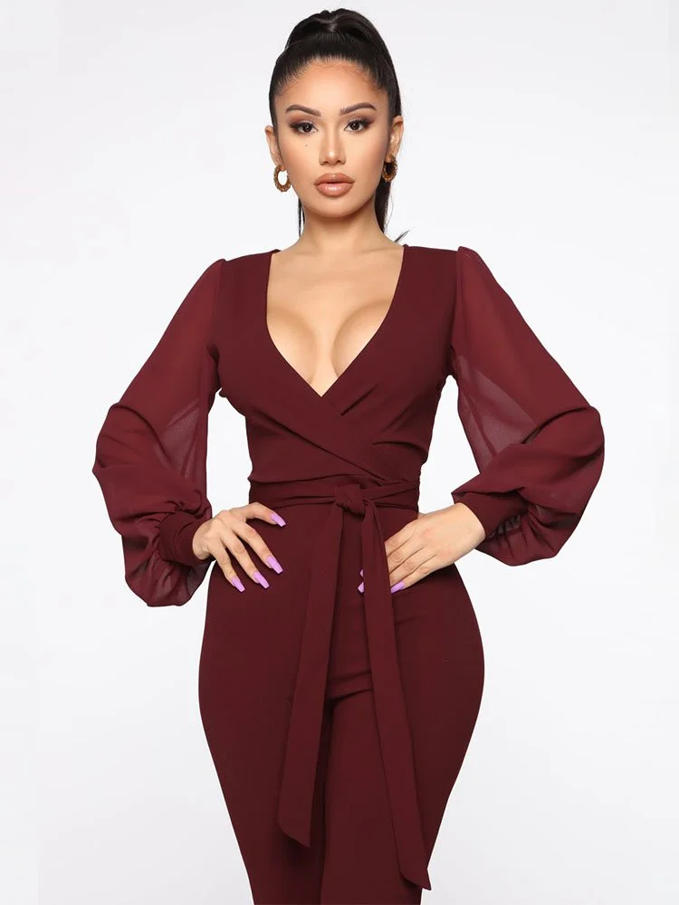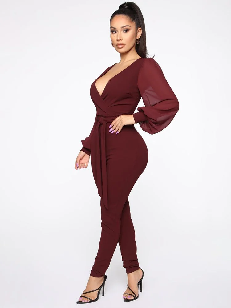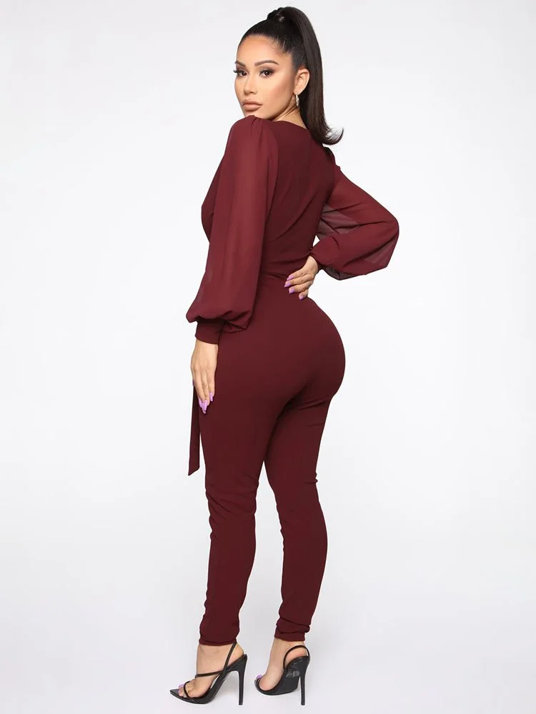Jumpsuit de crepé elástico con manga de gasa globo, sobrepelliz, lazo en la parte delantera, ojo de cerradura trasero con cierre de botón y pierna ajustada.