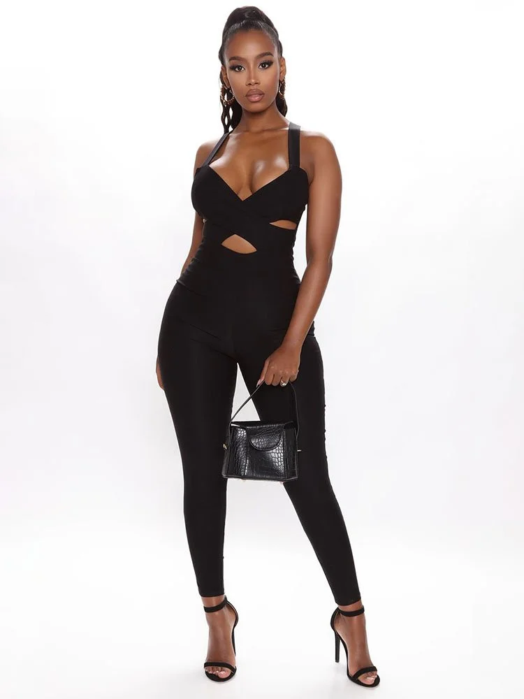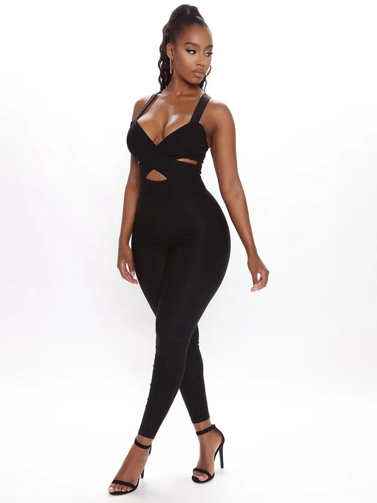 Jumpsuit sin mangas en tejido elástico con pierna ajustada, corte, espalda con cremallera y top cruzado.