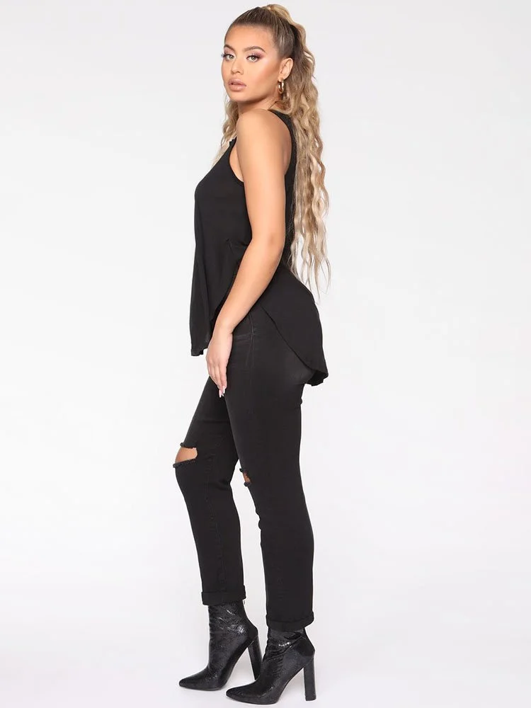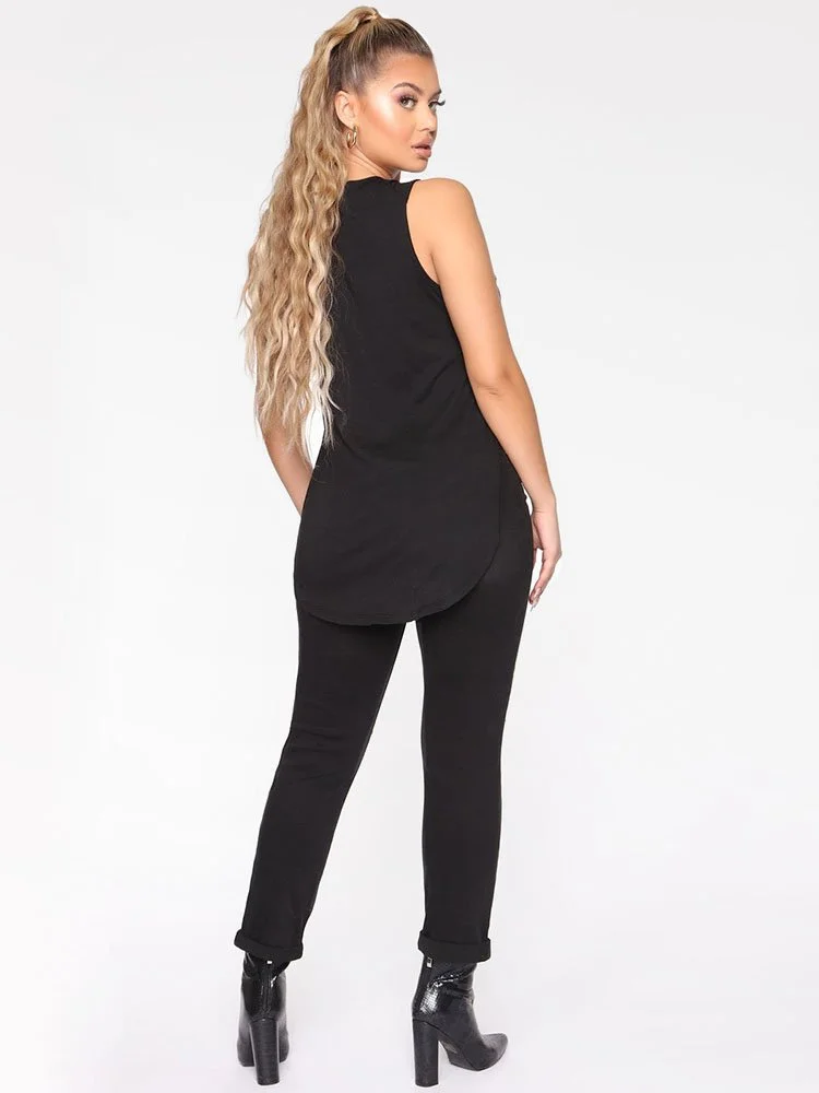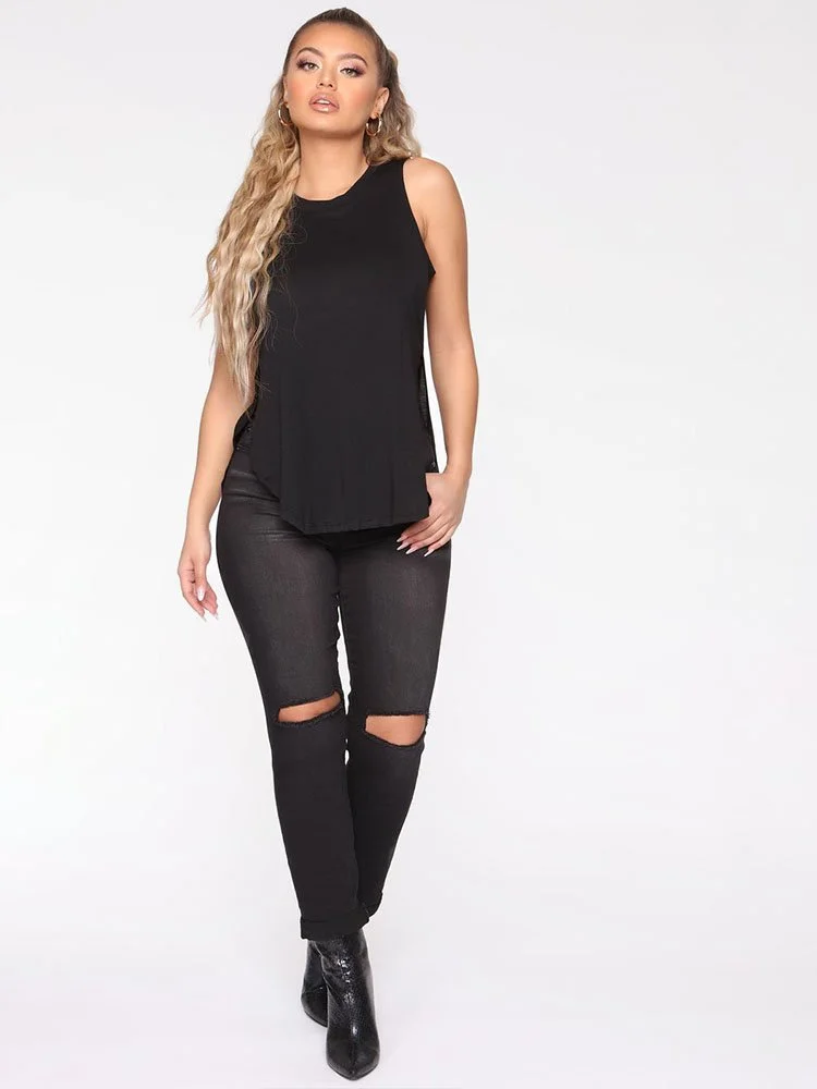 Camiseta sin mangas de ajuste relajado en tejido elástico con dobladillo redondo, aberturas laterales y escote redondo.