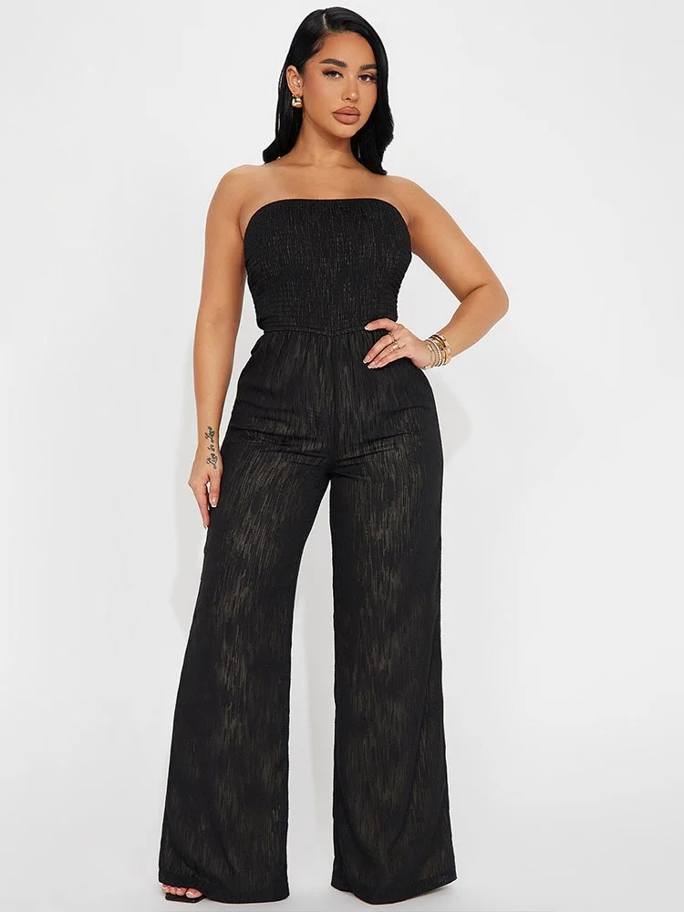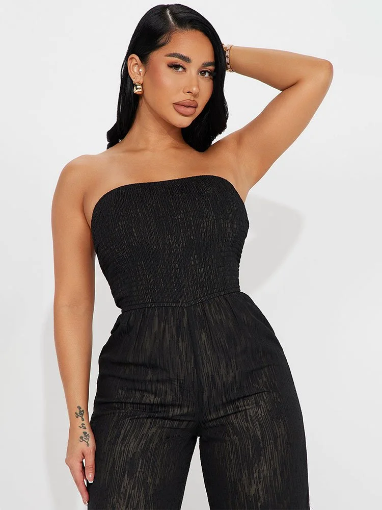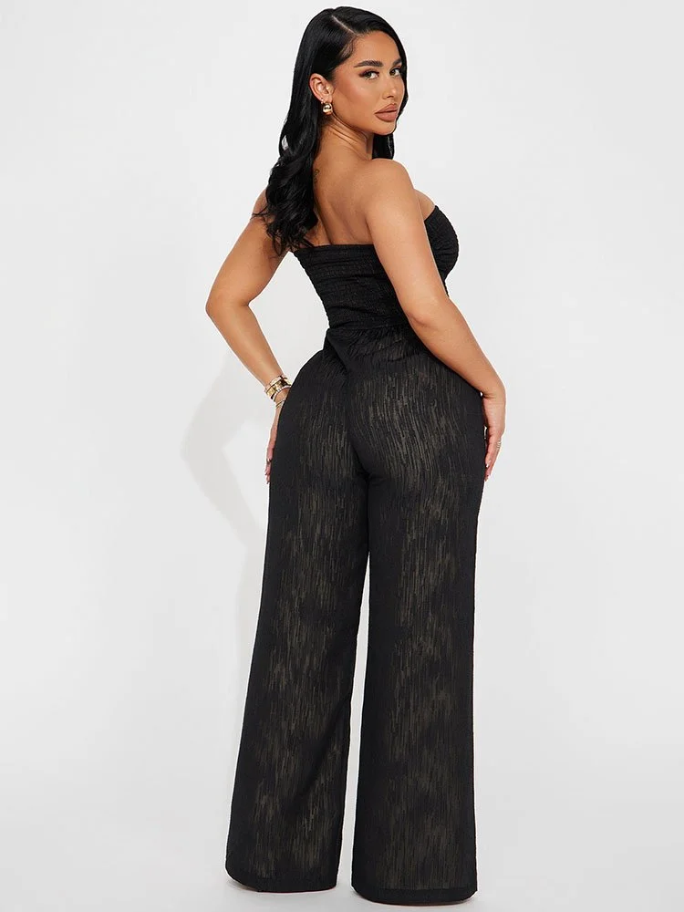 La blusa de tubo fruncida crea una silueta favorecedora y los pantalones anchos fluyen dramáticamente con cada paso. La tela de poliéster forrada tiene una apariencia texturizada y la parte superior de tubo y las piernas anchas resaltan las curvas de la manera correcta.