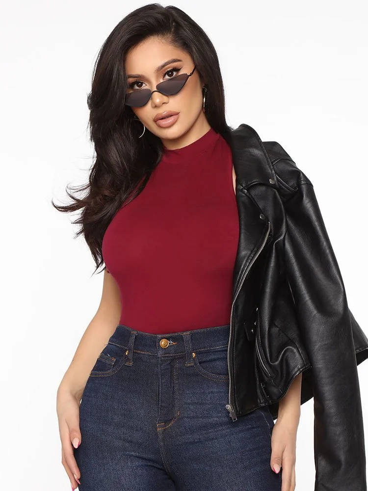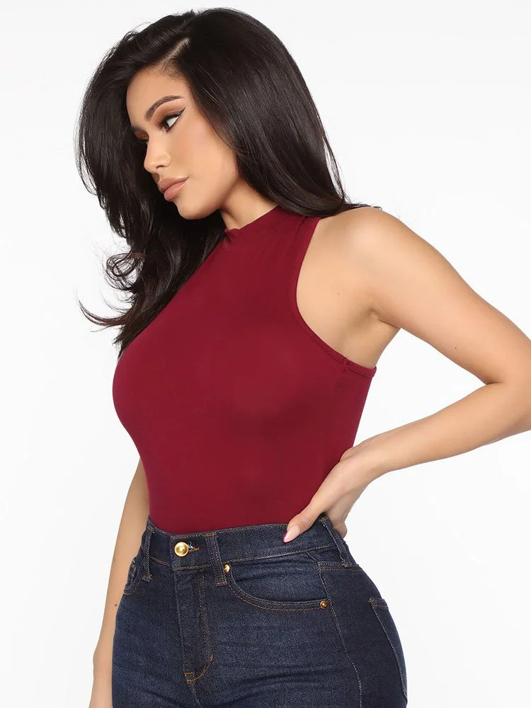 Body sin mangas con cuello alzado, tanga en la parte inferior y cierre a presión.