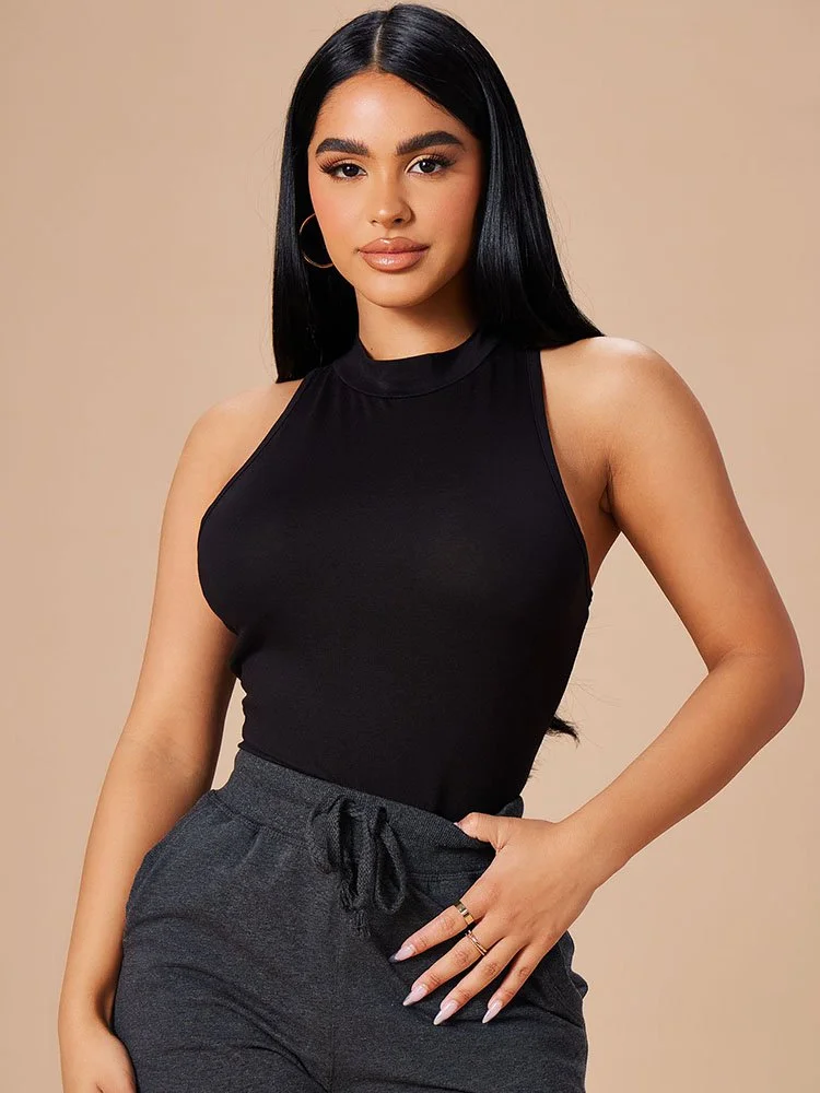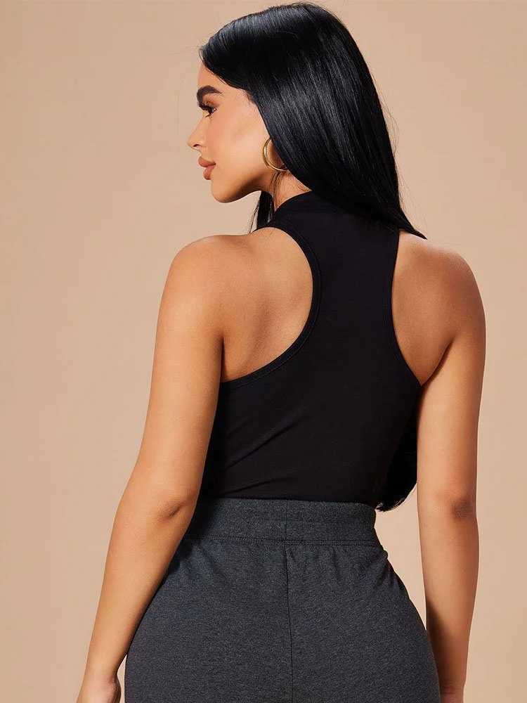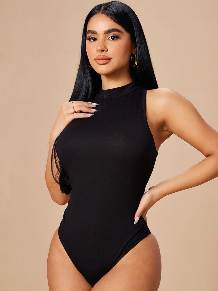 Body sin mangas con cuello alzado, tanga en la parte inferior y cierre a presión.