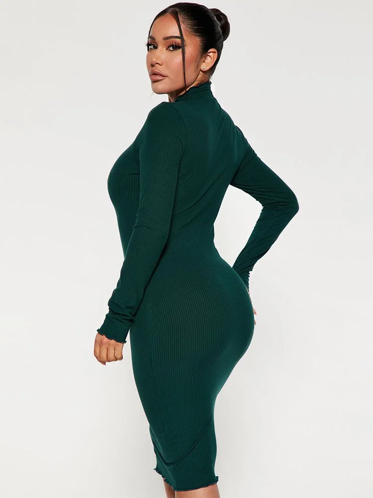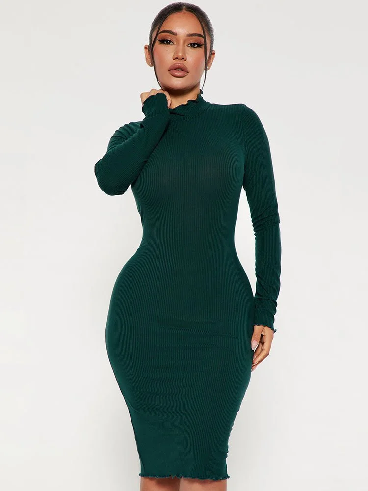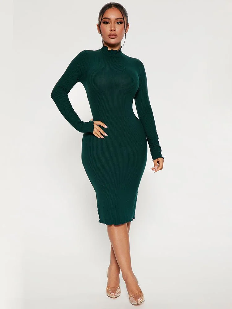 Vestido medio de canalé con cuello alzado, manga larga y ribete lechuga.