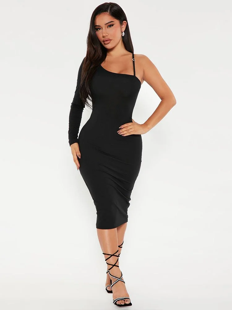 Vestido medio de canalé con un hombro de manga larga y tirante fino con detalle de adorno.