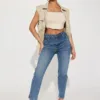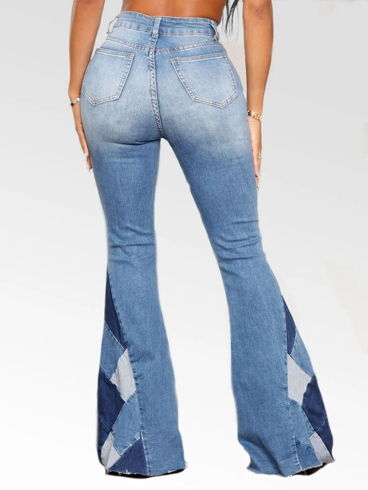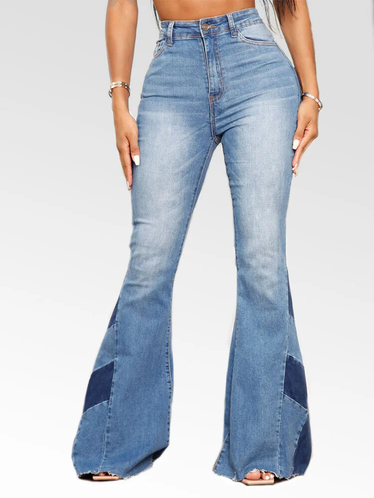 Jean acampanado en pierna, de tiro alto, tono azul medio, de material elástico.