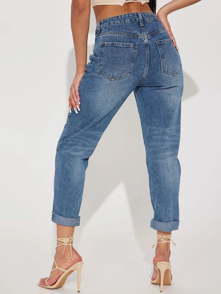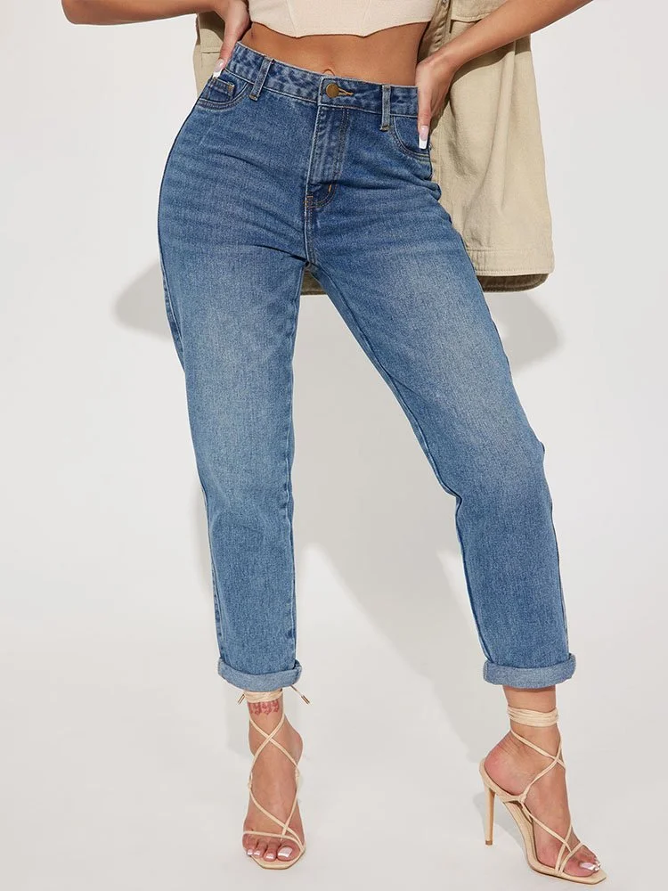 Mom Jean con 5 bolsillos y puño enrollado.
