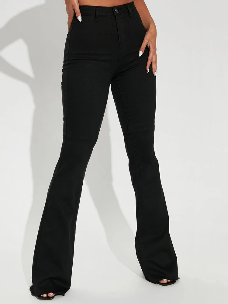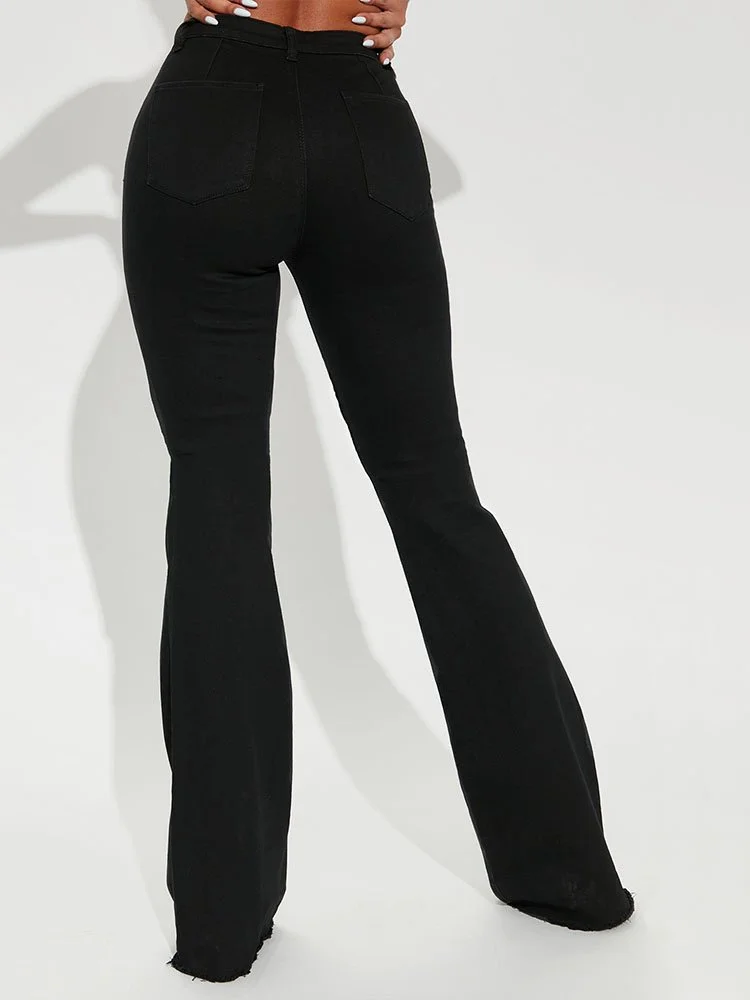 Jeans bota ancha en denim muy elástico sin bolsillos delanteros, bolsillos traseros funcionales y dobladillo sin rematar.