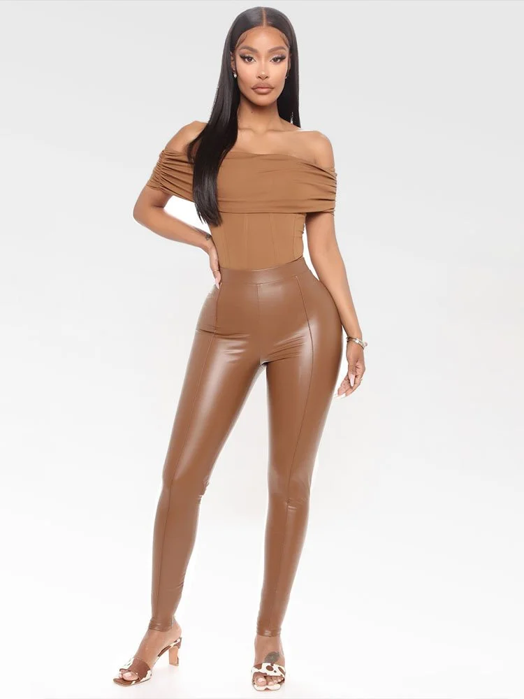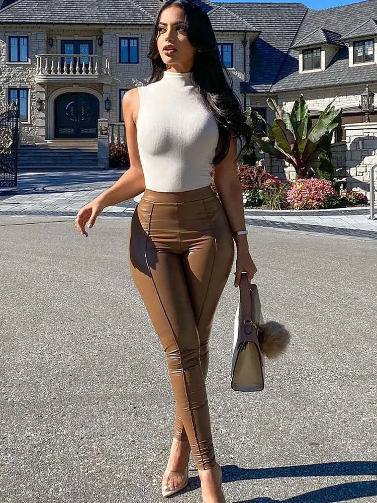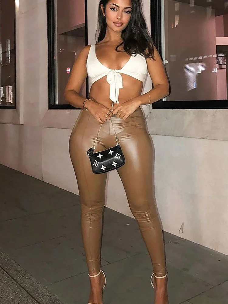 De tela elástica y liviana crea la apariencia del cuero. Legging con diseño de pierna ajustada y de cintura alta.