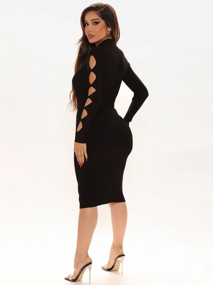 Vestido jersey medio con cuello alzado, manga larga y detalle cut out.