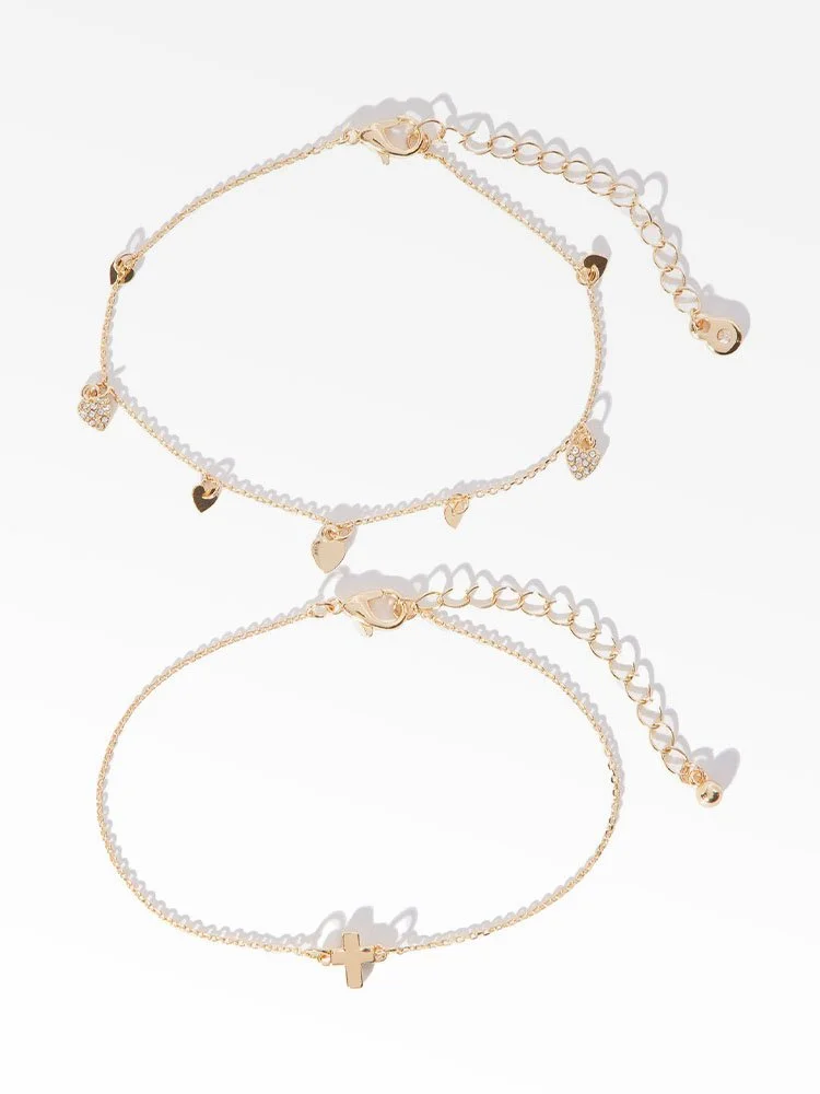 Tobillera en capas con cola de cruz, colgante de corazón, detalle de strass y cierre de mosquetón.