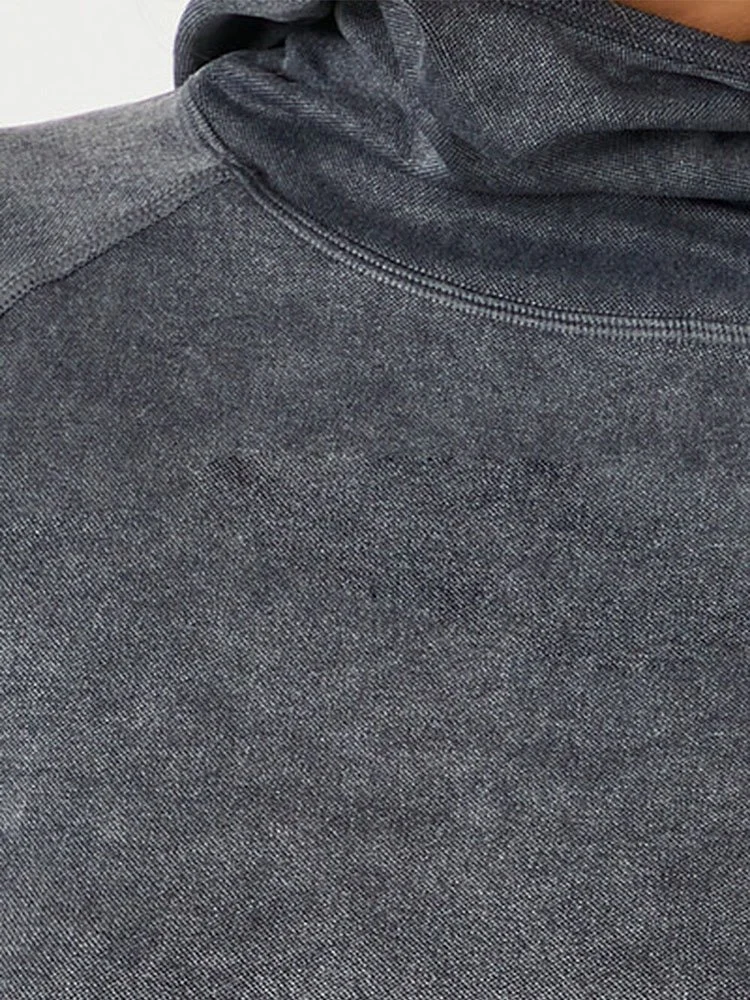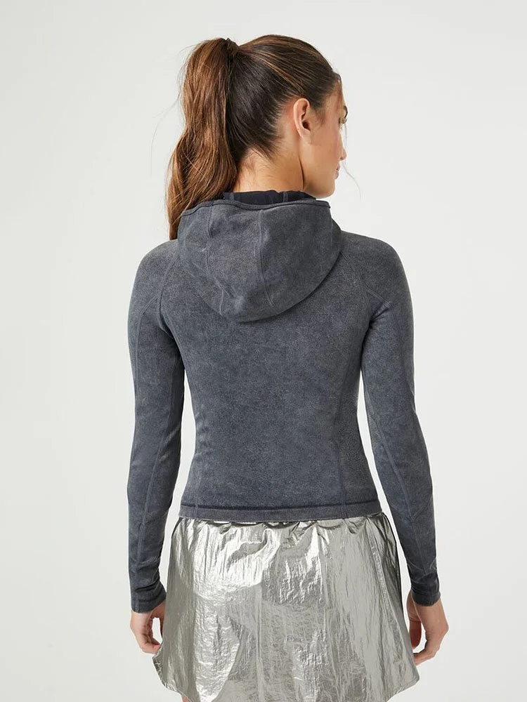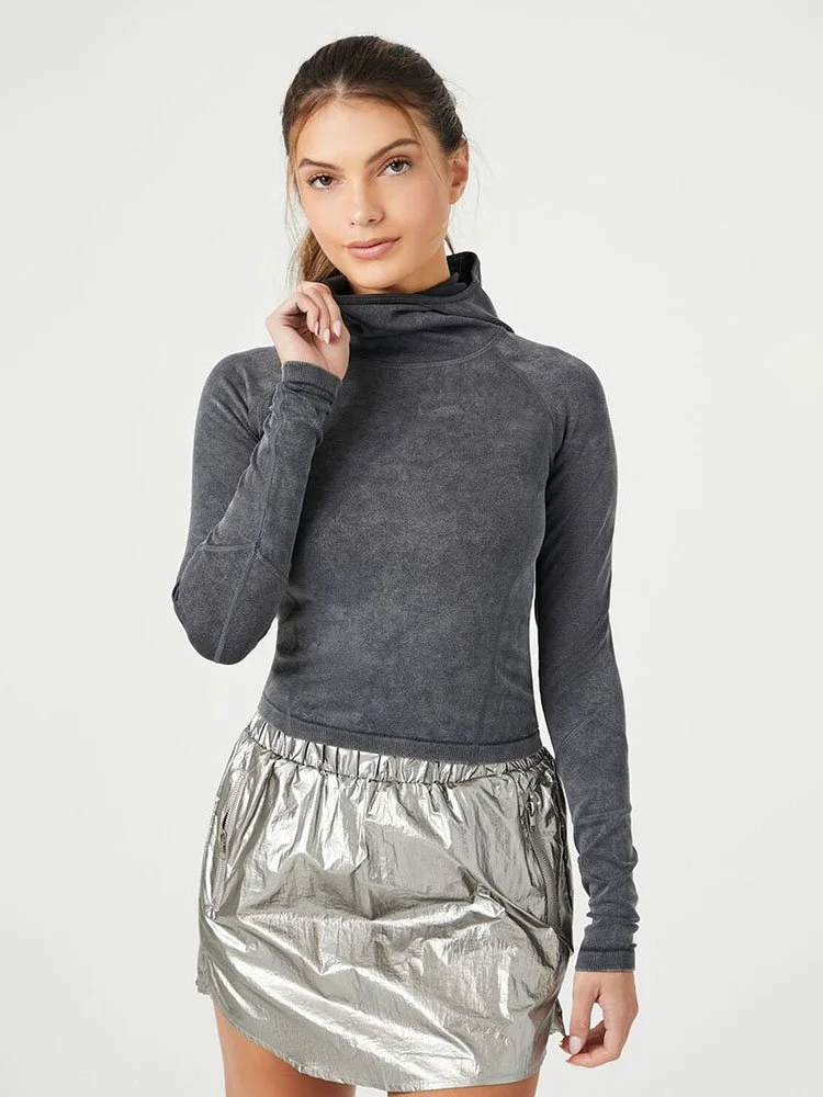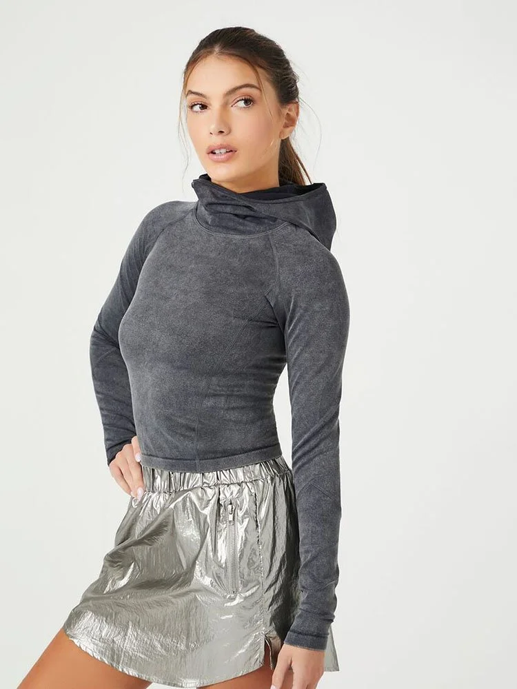 Una camiseta de punto deportiva con lavado mineral, cuello alto, capucha, mangas largas raglán, dobladillo corto, ajuste sin costuras que esculpe, levanta y suaviza, tela transpirable que absorbe la humedad y costuras que quedan planas para una máxima comodidad.