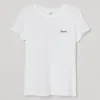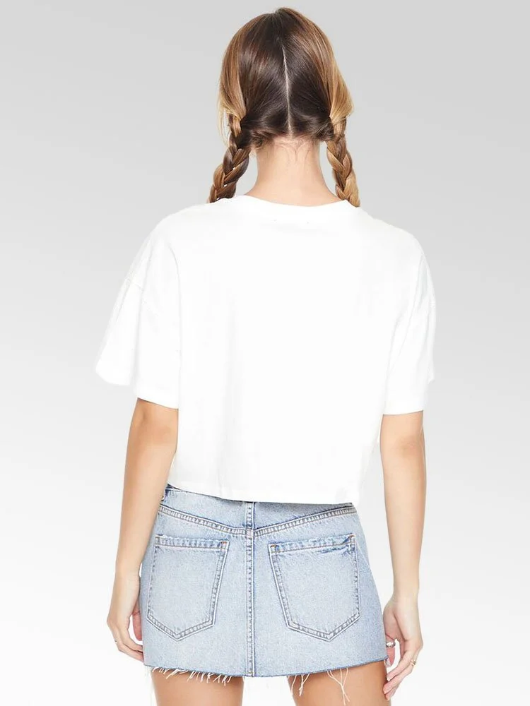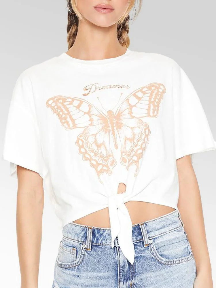 T-shirt con cuello redondo, texto «Dreamer» en el pecho, gráfico de mariposa, mangas cortas caídas, cierre frontal con lazo y dobladillo corto.