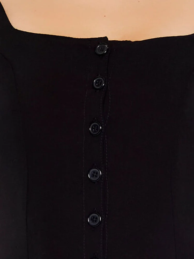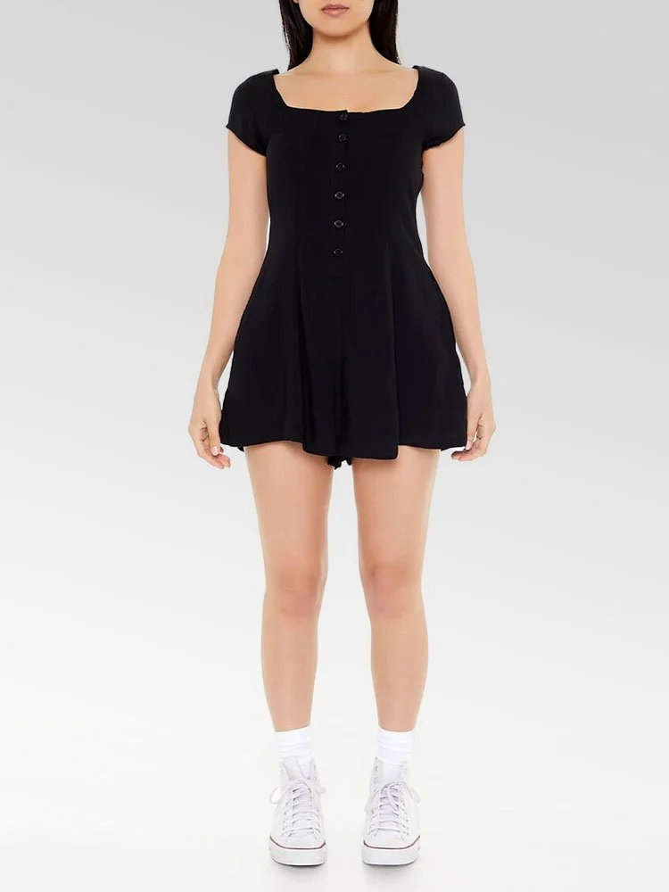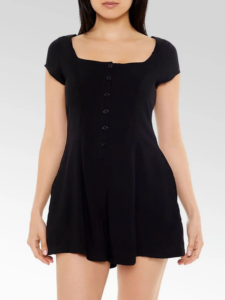 Braga o enterizo de tela fresca con escote y espalda de corte cuadrado, cierres con botones en la parte delantera, mangas cortas y diseño de falda pantalón.