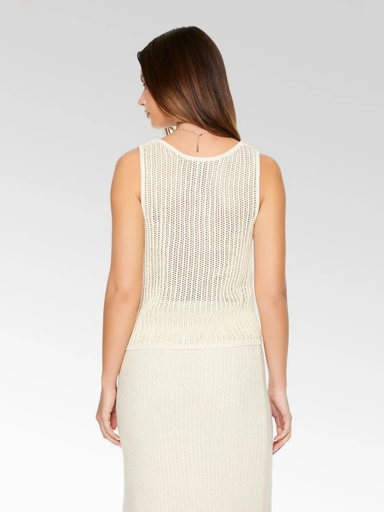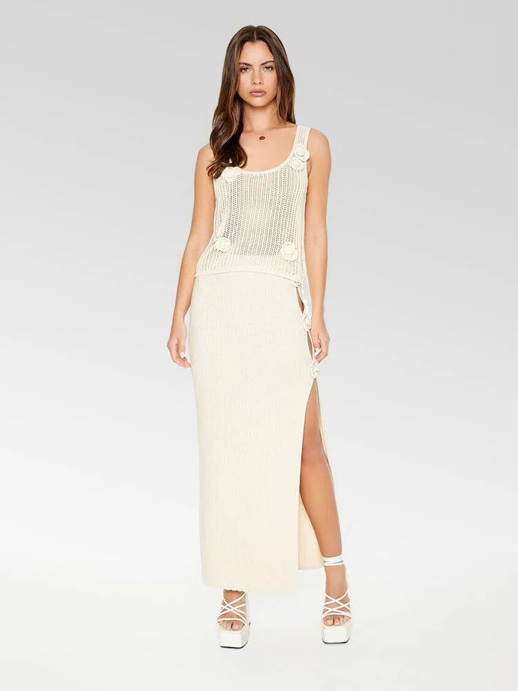 Blusa tipo guarda camisa sin mangas tejido tipo crochet con una construcción transparente, adornos de rosetas por todas partes, escote y espalda de corte redondo y un ajuste fluido.