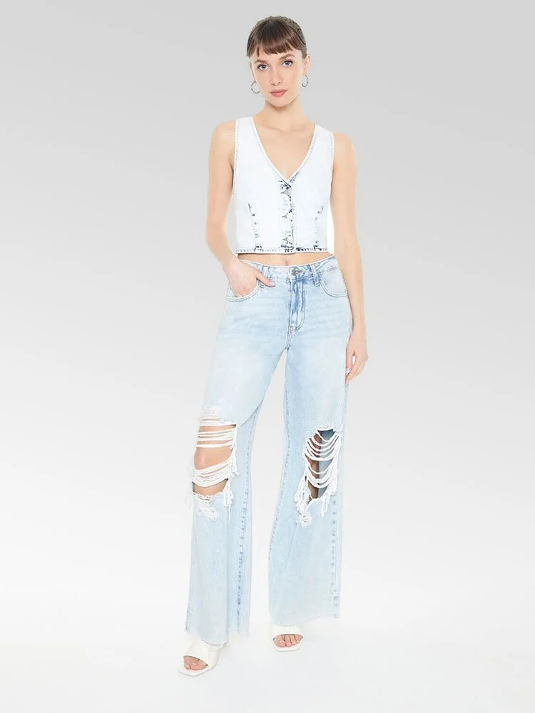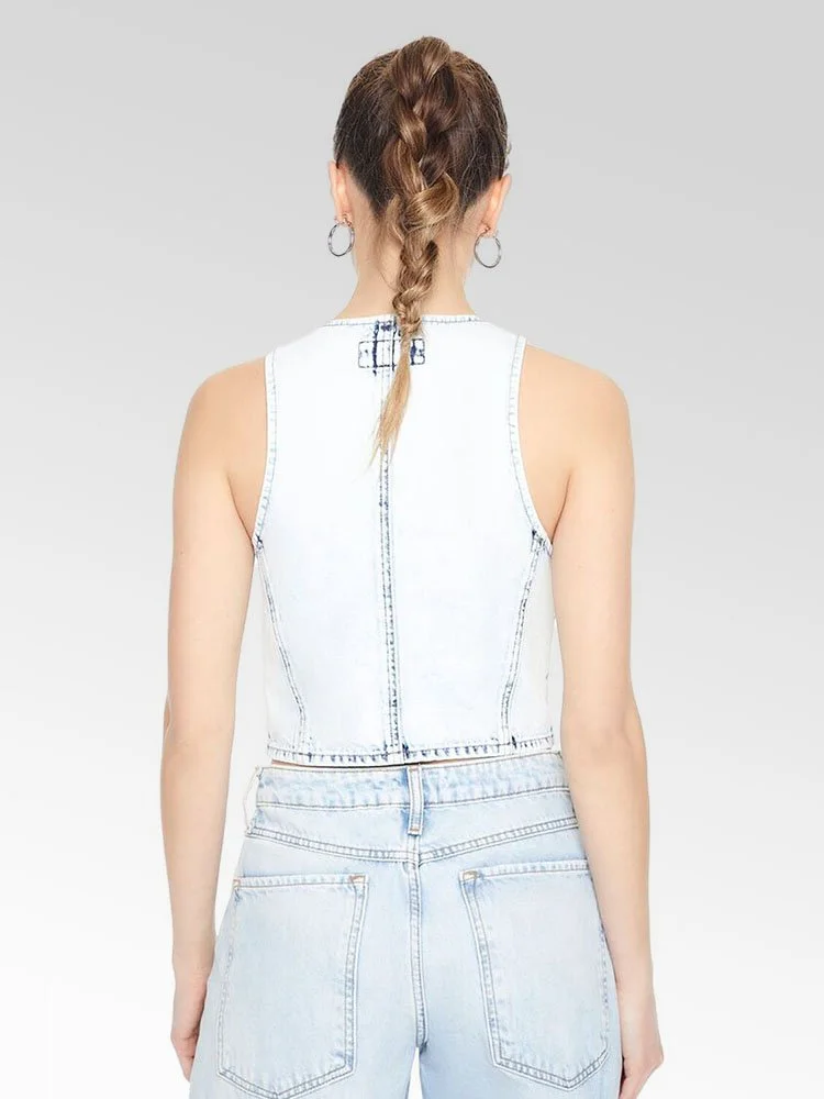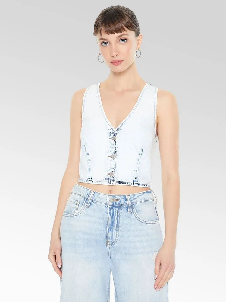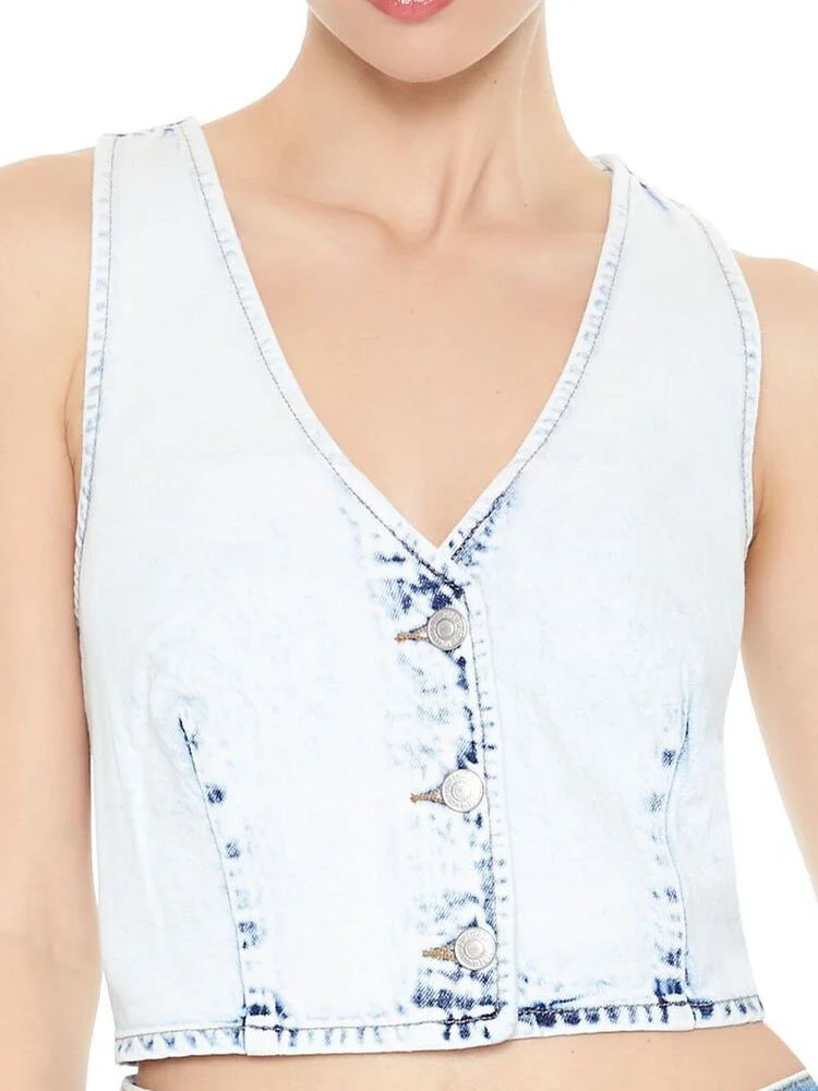 Chaleco prelavado en toda su superficie, cierres con botones en la parte delantera, costuras princesa, escote en V y dobladillo corto.
