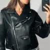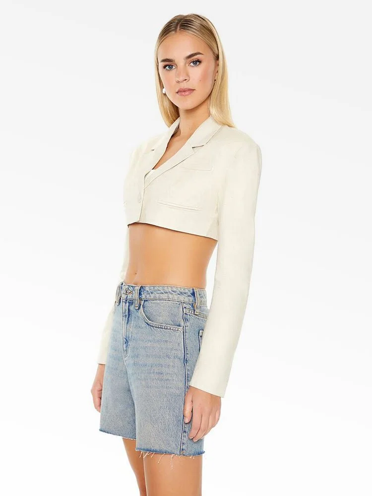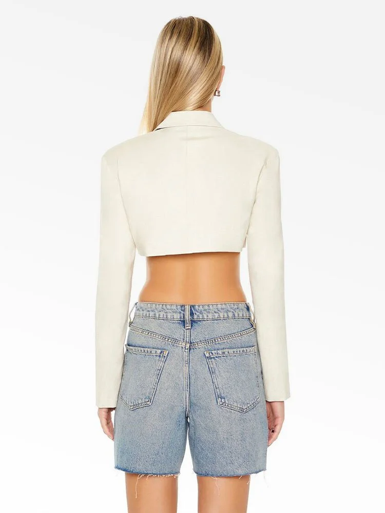 Un blazer tejido con solapas con muescas, cierre frontal con un solo botón, bolsillos frontales ribeteados y ribeteados, mangas largas, dobladillo corto y corte cuadrado.