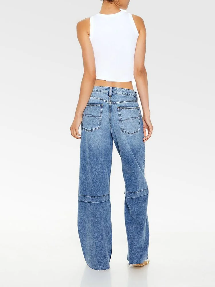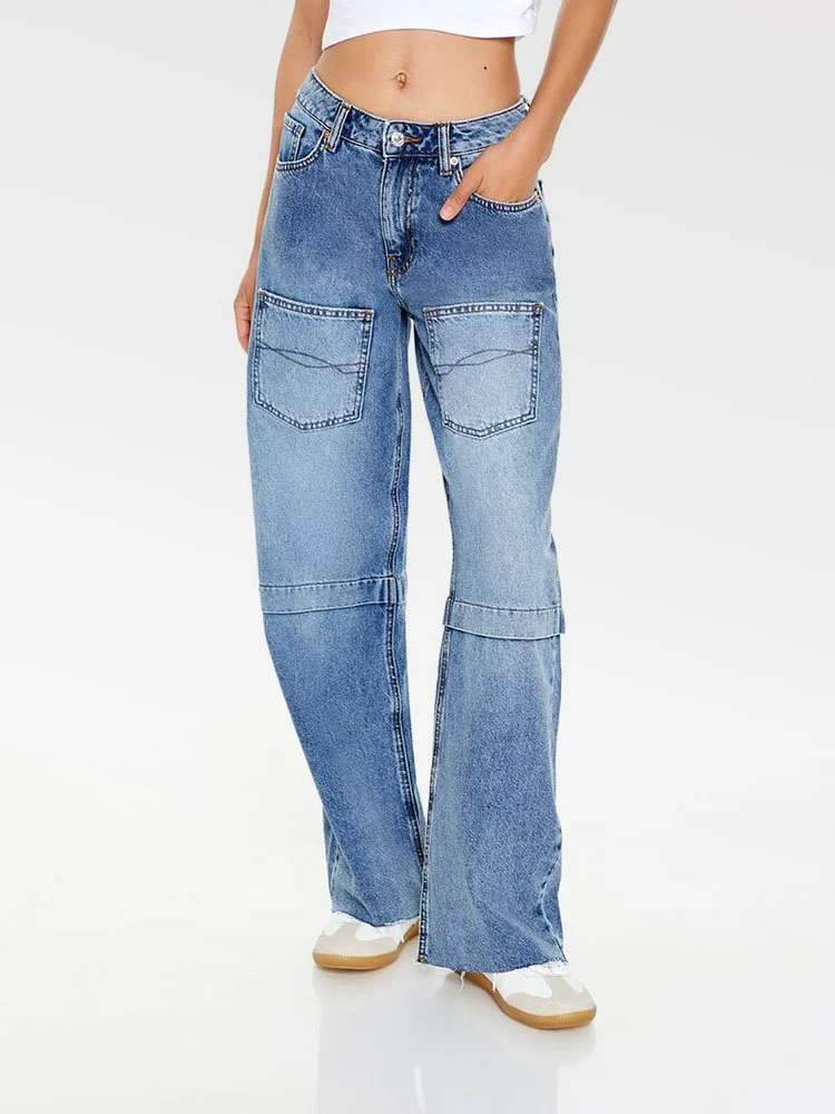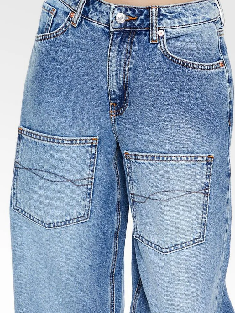 Confeccionados en denim no elástico, este par de jeans presenta cintura media, trabillas para cinturón, cierre con cremallera y botones en la parte delantera, bolsillos delanteros inclinados, un bolsillo para monedas, pierna ancha y bolsillos de parche cargo en la pierna y la espalda con bordado.