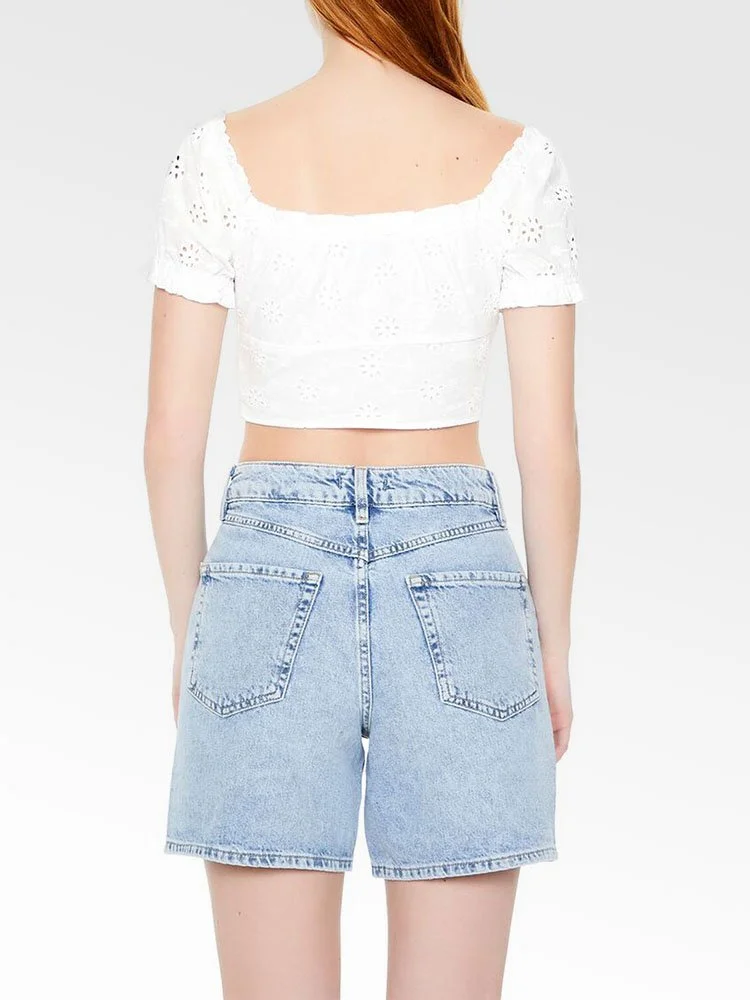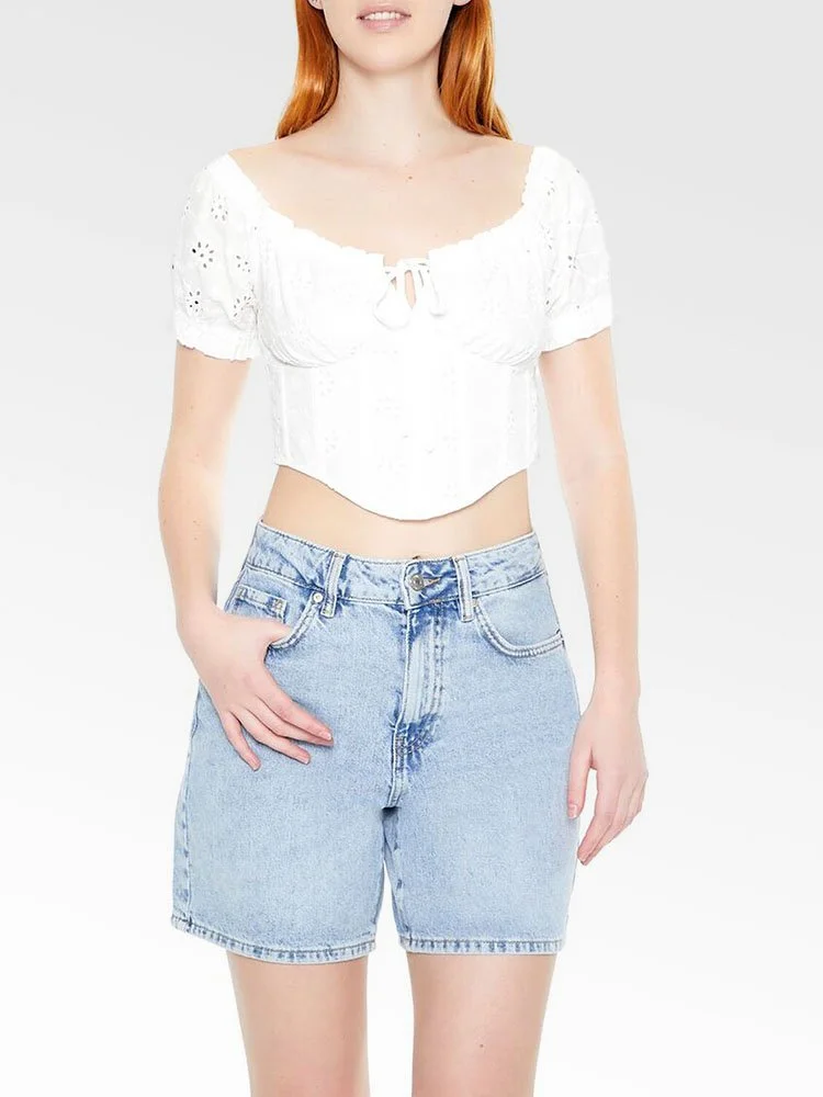 Un top corto tejido que presenta un patrón de ojales florales por todas partes, diseño inspirado en corsé, ribete de volantes, escote y espalda de corte cuadrado, mangas cortas abullonadas, cierre de lazo delantero con nudo, varillas y dobladillo corto curvo.