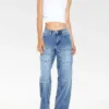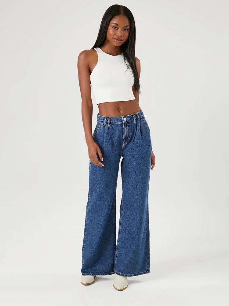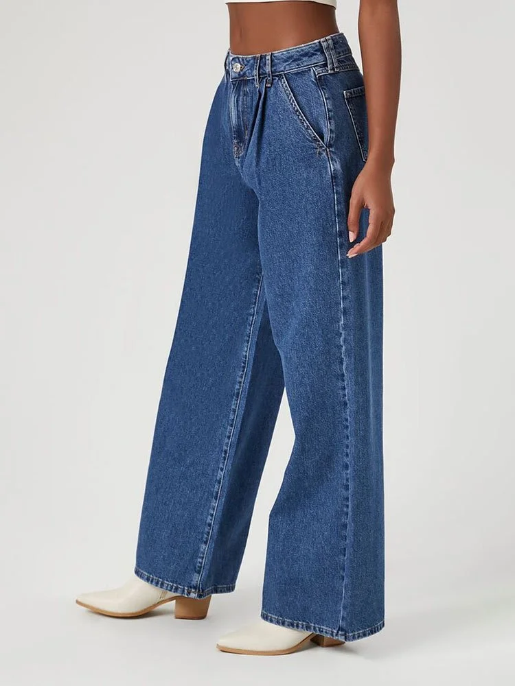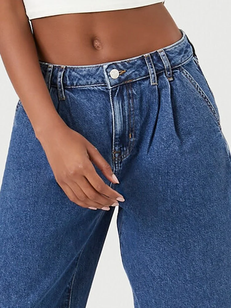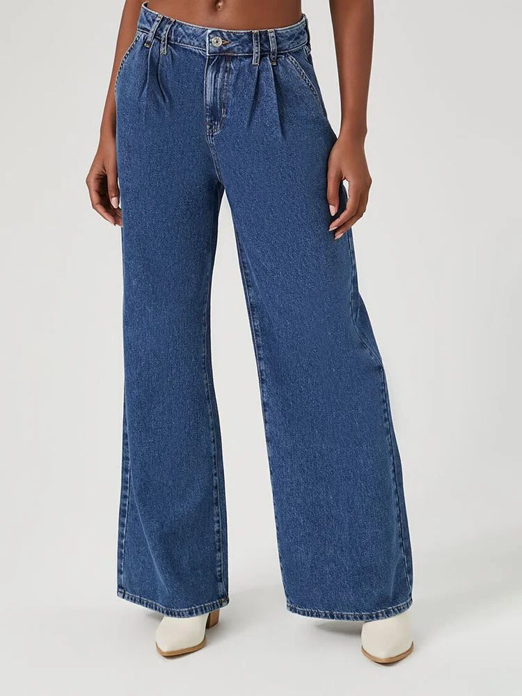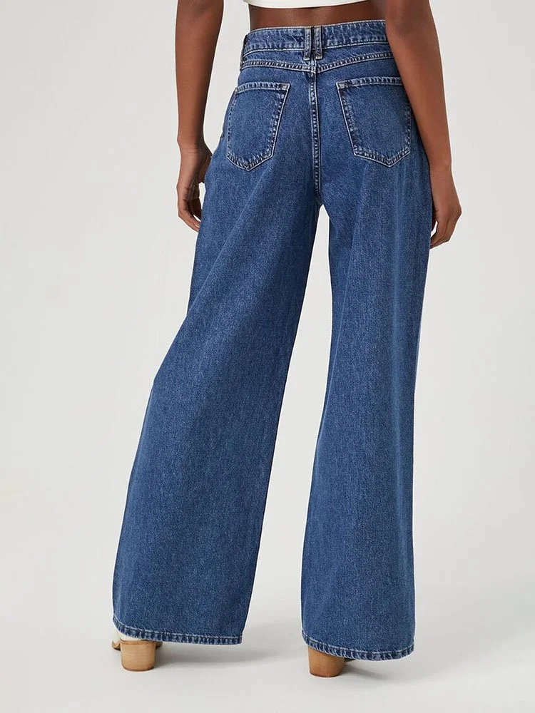 Un par de jeans de pierna ancha con una construcción de cuatro bolsillos, trabillas para cinturón, cierre de cremallera y botones en la parte delantera y cintura alta.