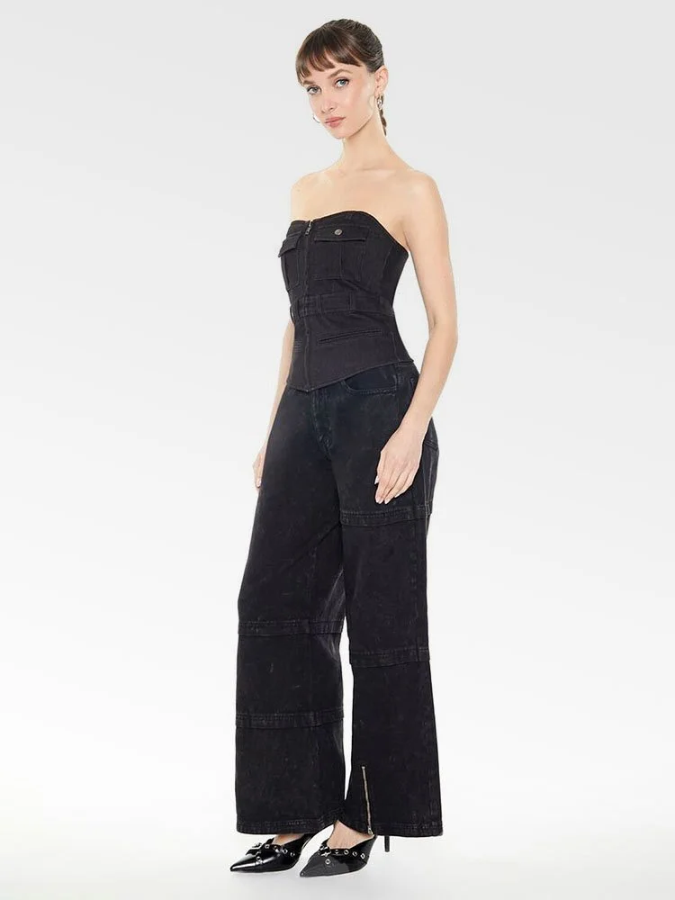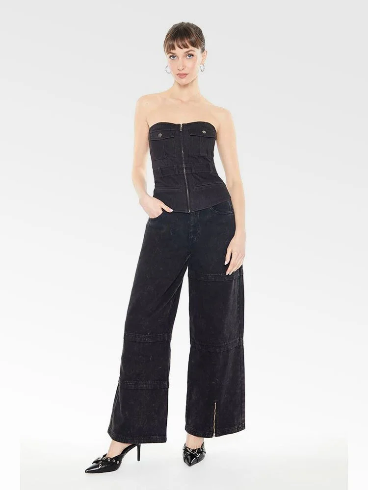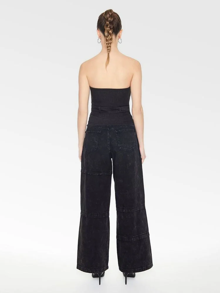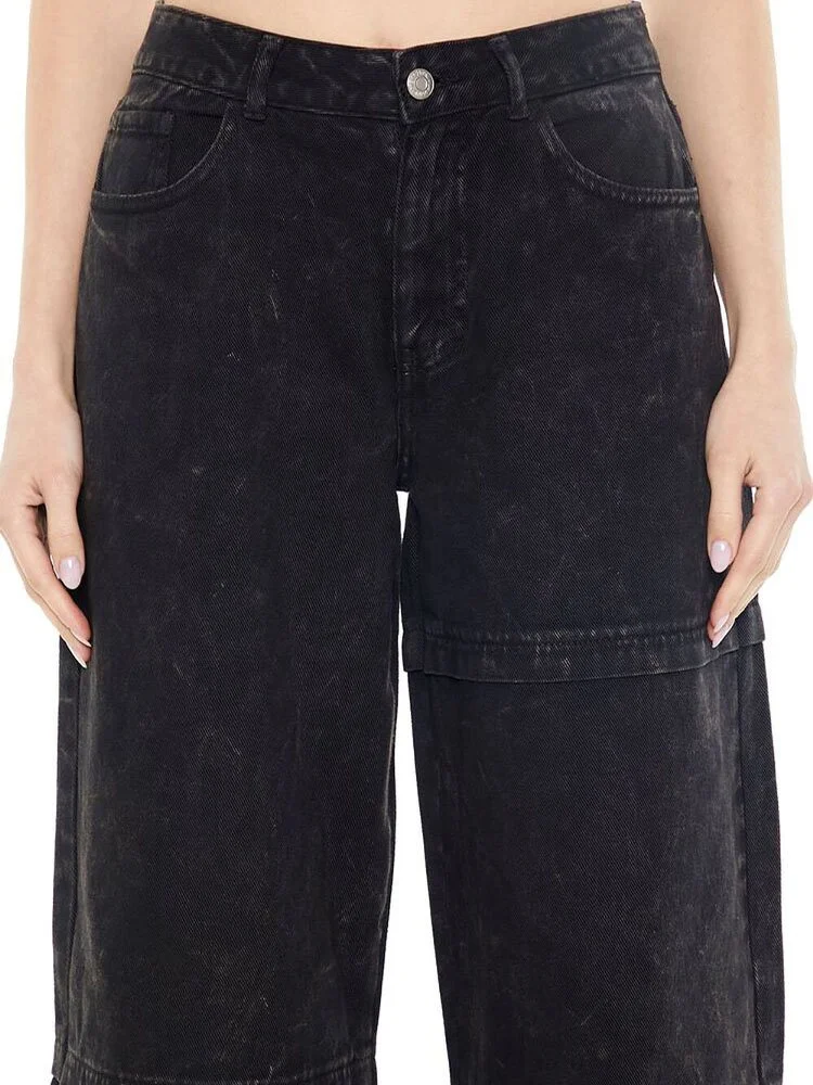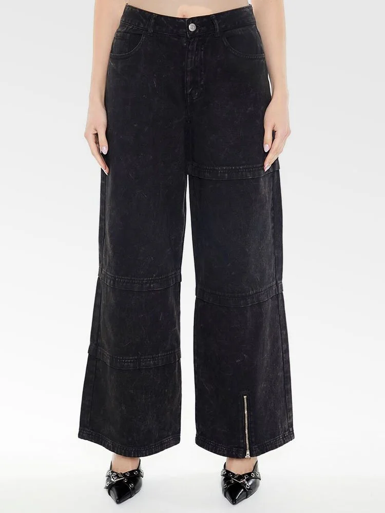 Confeccionados en denim elastizado, este par de jeans de pierna ancha presenta un diseño renovado, una construcción de cinco bolsillos, lavado mineral por todas partes y una cremallera expuesta en el frente en el dobladillo.