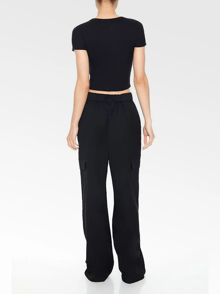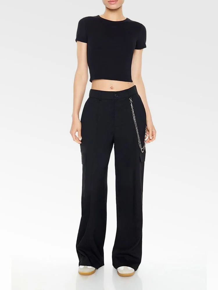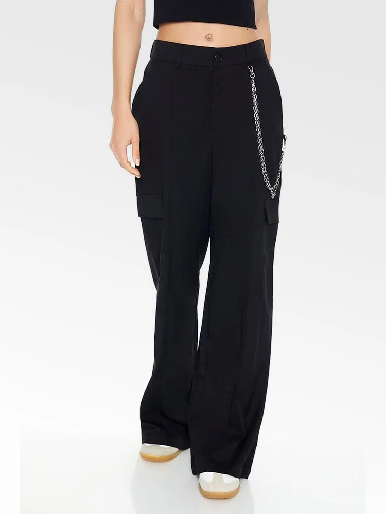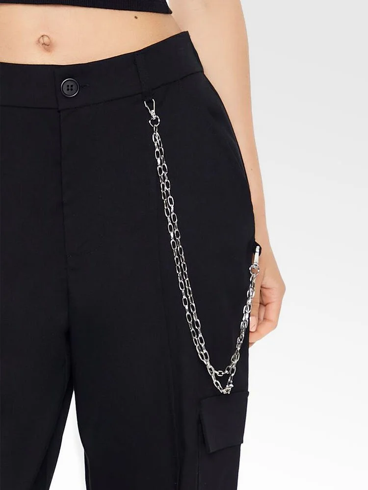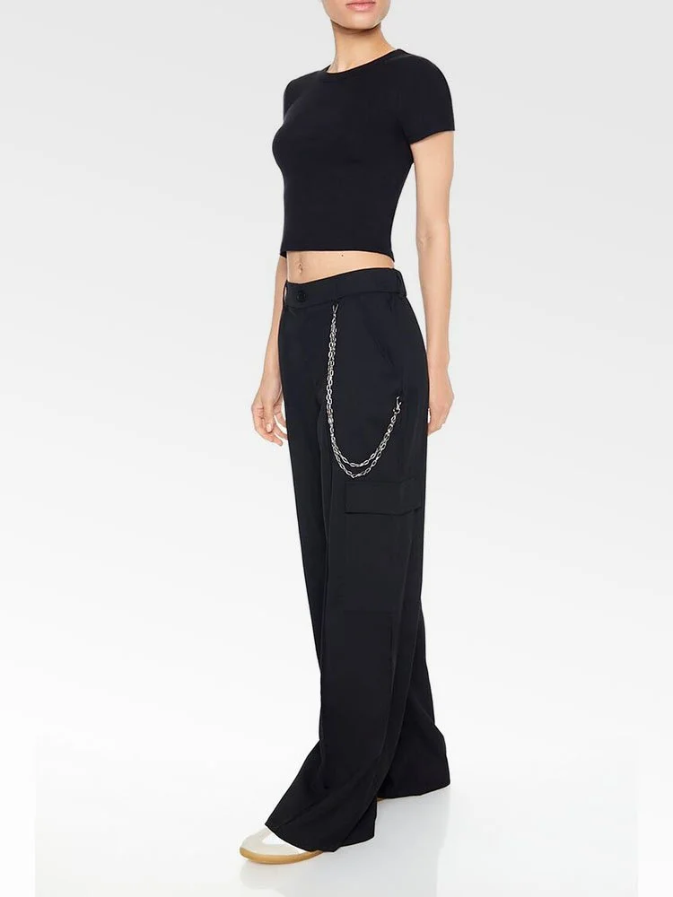 Un par de pantalones tejidos con cintura alta elastizada, bragueta con cremallera y cierre con botones en la parte delantera, cadenas de billetera extraíbles, bolsillos frontales inclinados, pierna recta y bolsillos con solapa tipo cargo en las piernas.