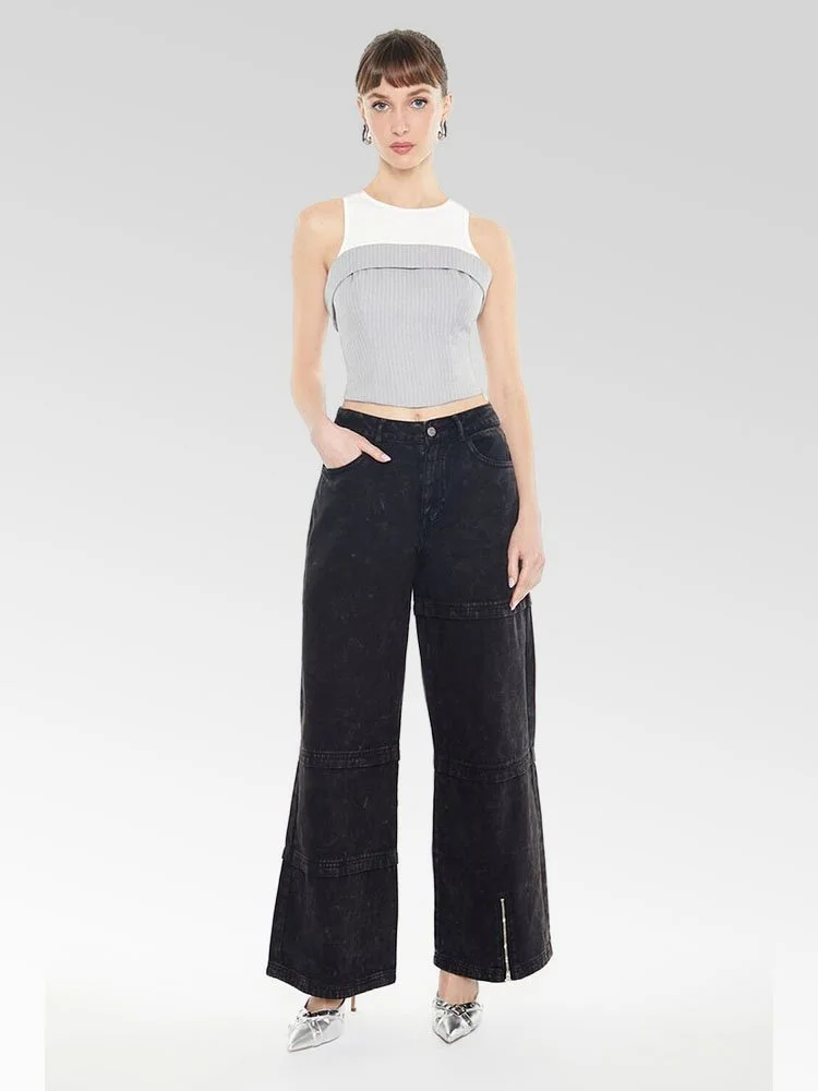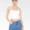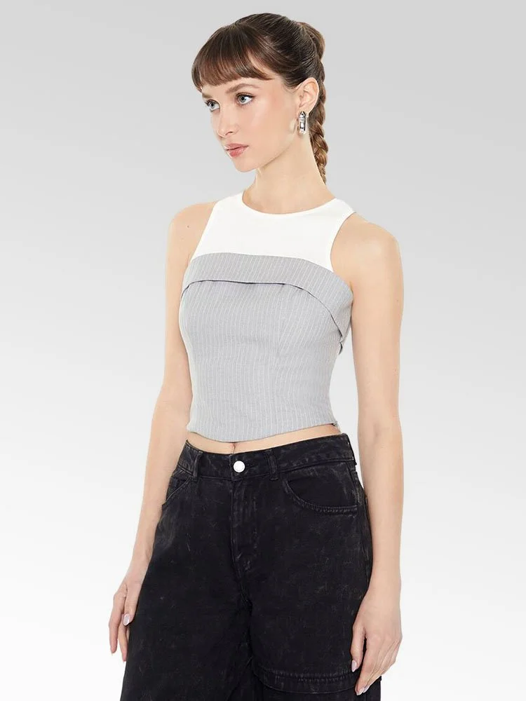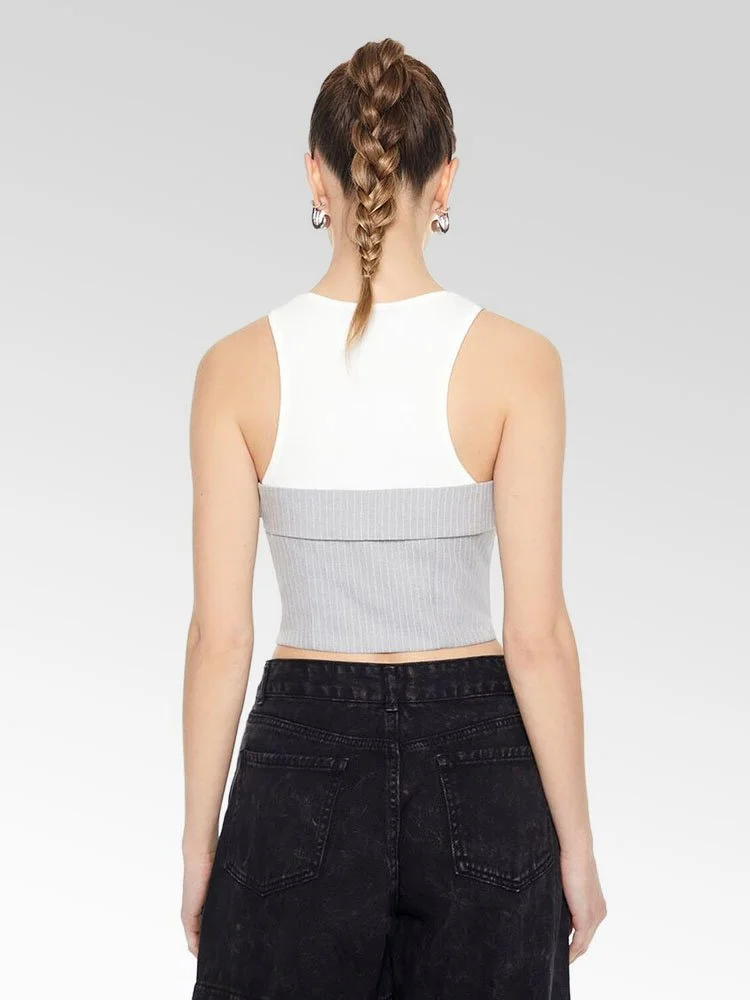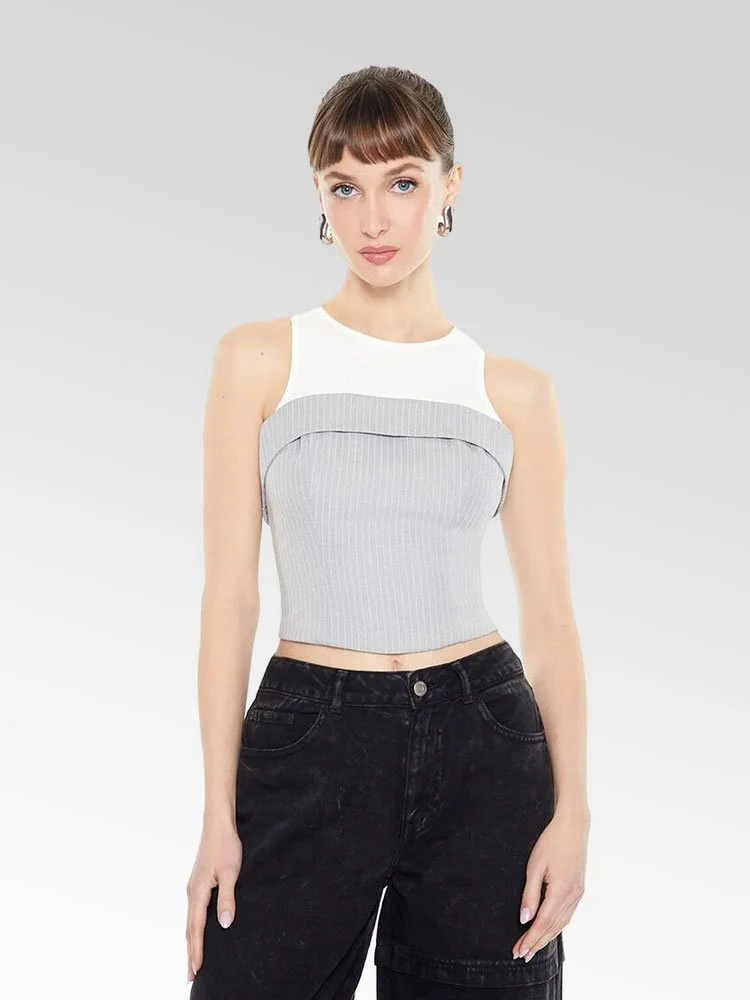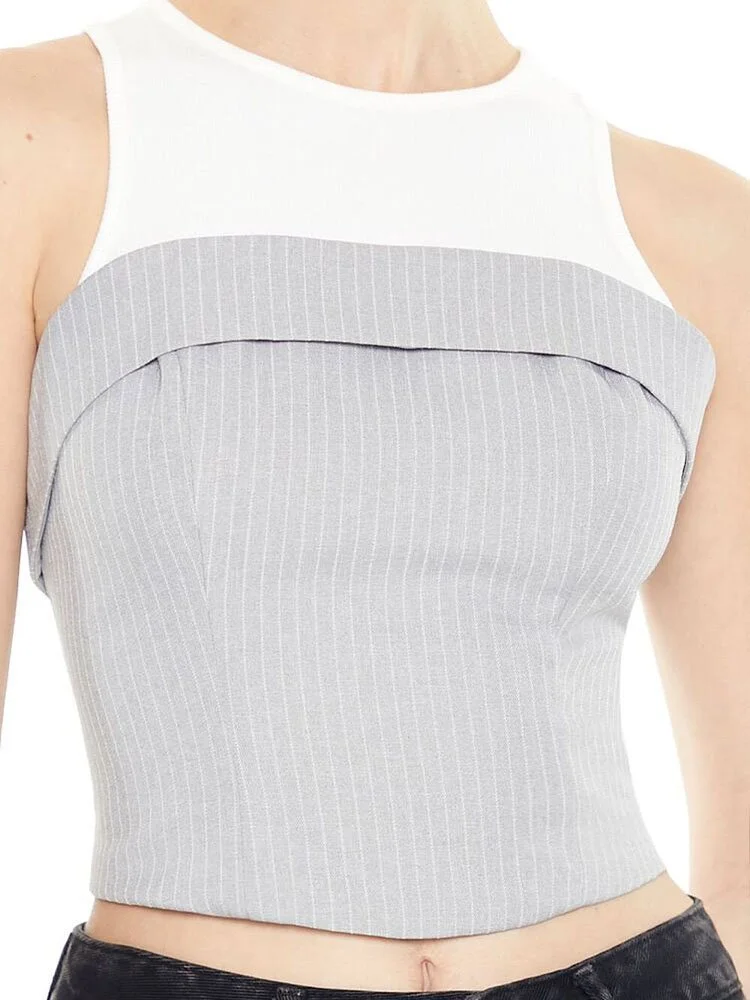 Top combinado en gabardina que presenta un diseño de camiseta sin mangas en algodón levemente acanalado en capas con cuello redondo, así como un top tubo adjunto con un diseño plegable, patrón de rayas diplomáticas por todas partes y dobladillo corto.
