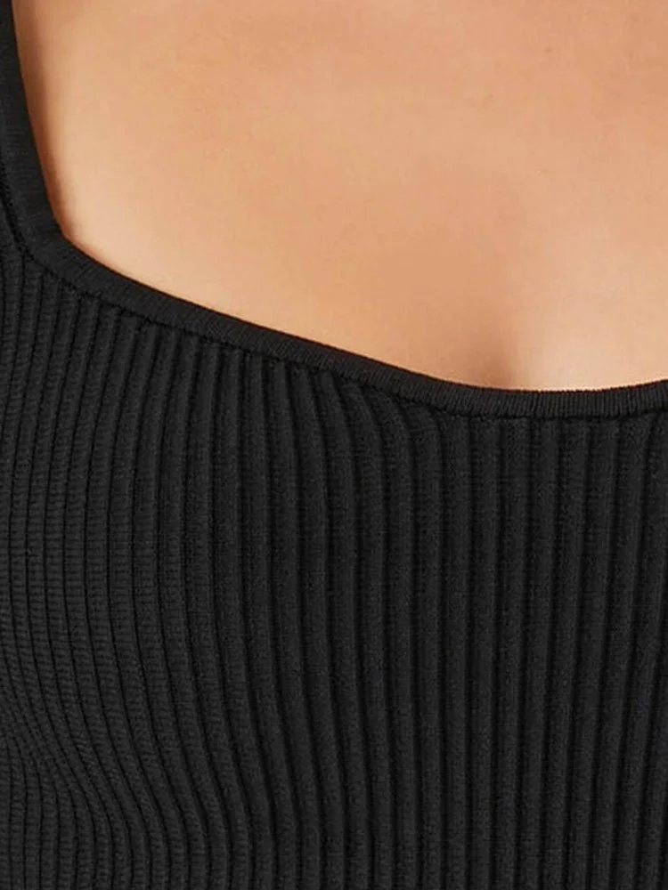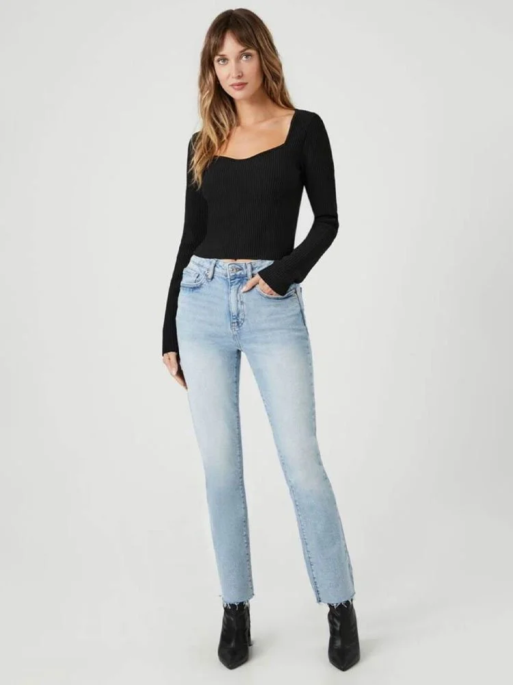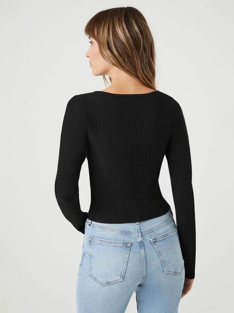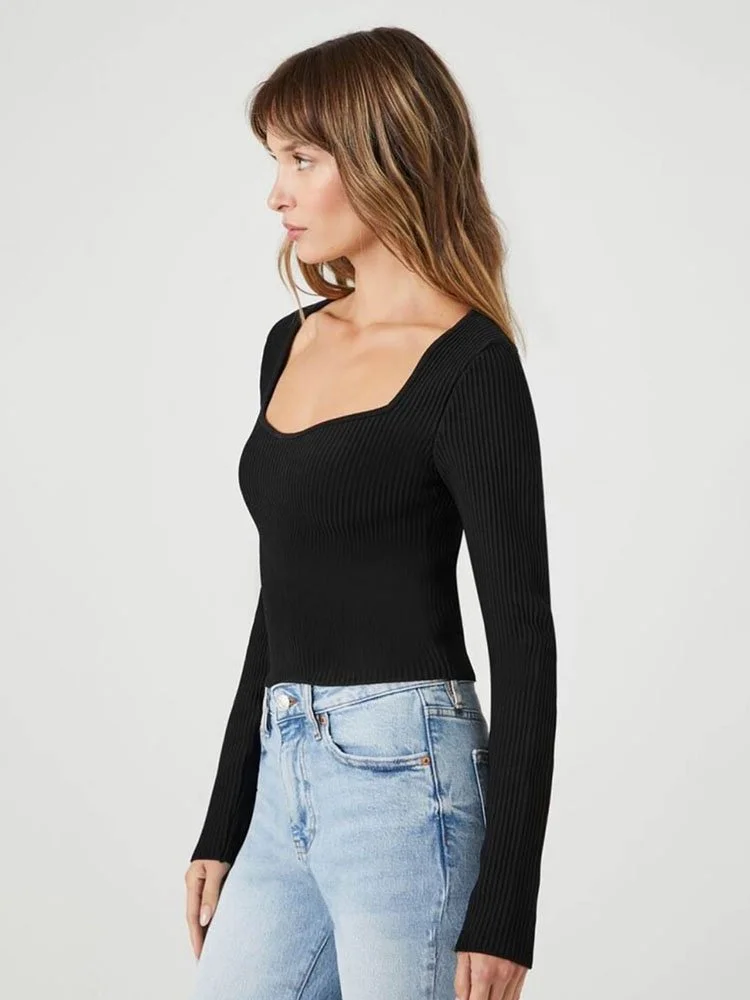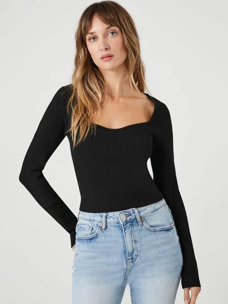 Un suéter de punto acanalado con escote en forma de corazón, mangas largas y dobladillo corto.