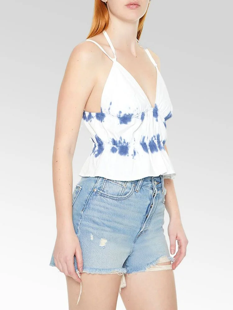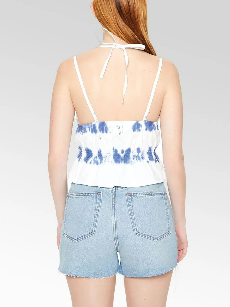 Blusa tie-dye en toda su extensión, tirantes fijos, escote halter con lazo, construcción escalonada, ribete elastizado, dobladillo semicorto y dobladillo con volante.