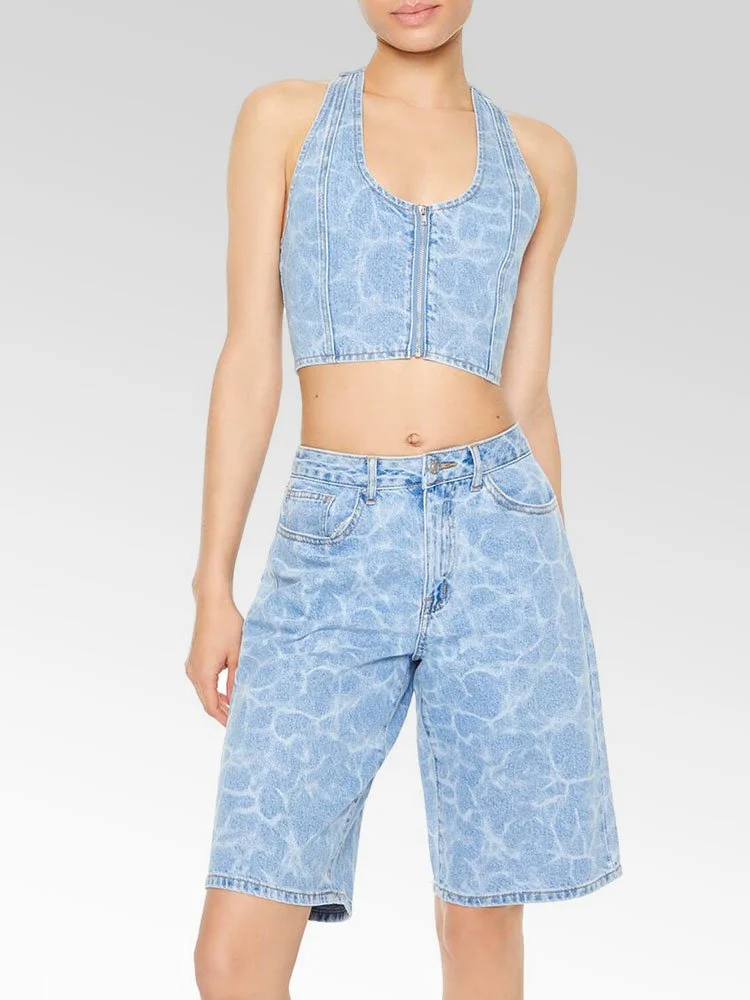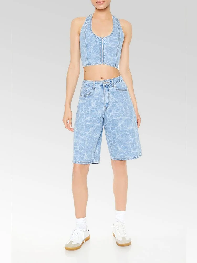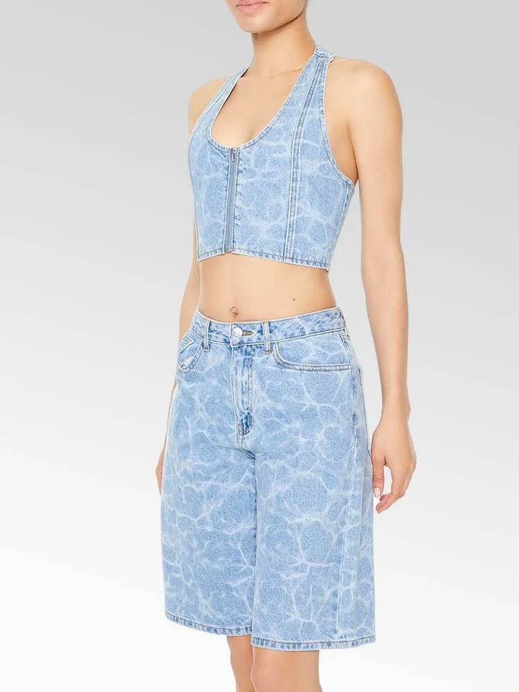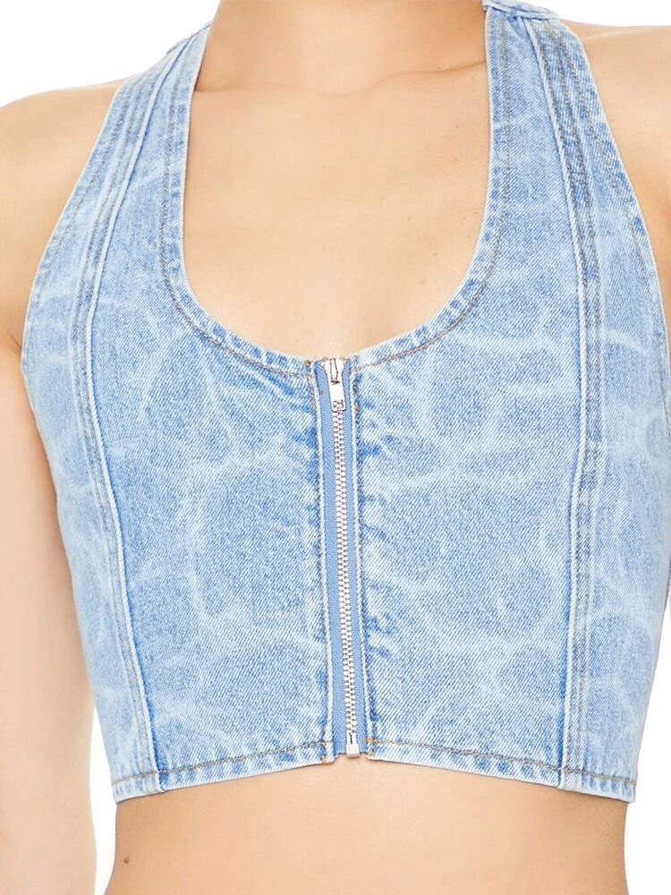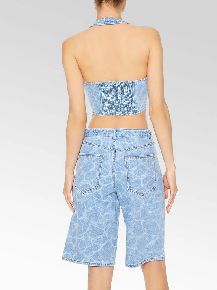 Confeccionado en denim no elástico, este top corto presenta un estampado de agua por todas partes, escote halter, cierre frontal con cremallera, panel posterior fruncido y espalda abierta.