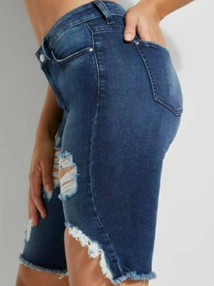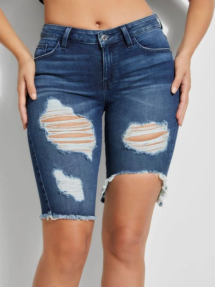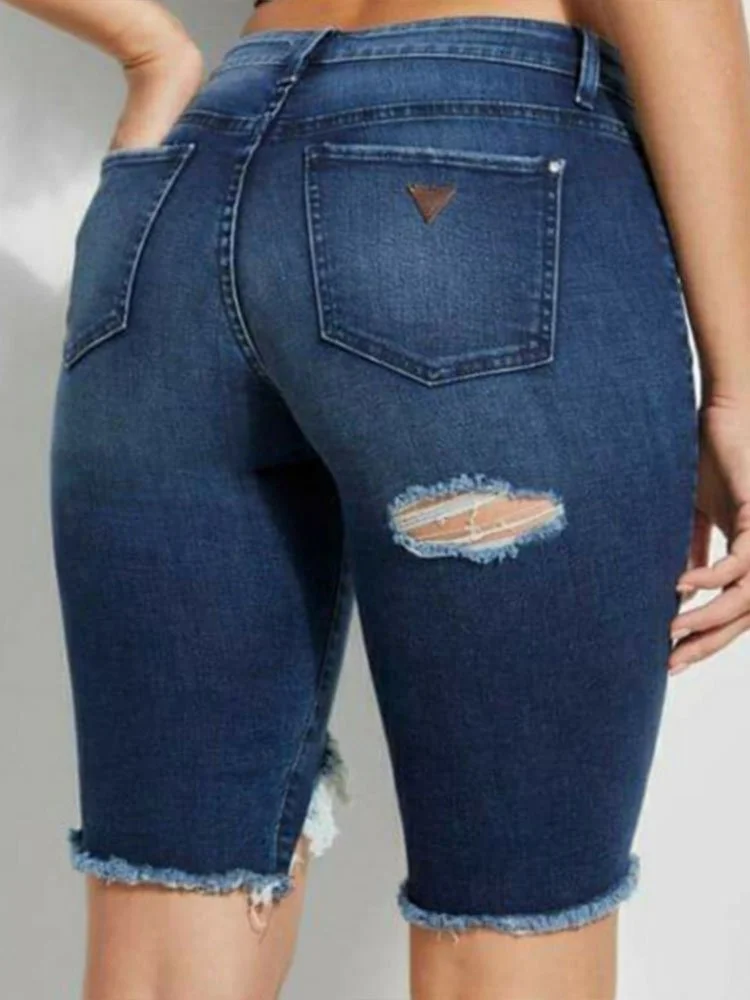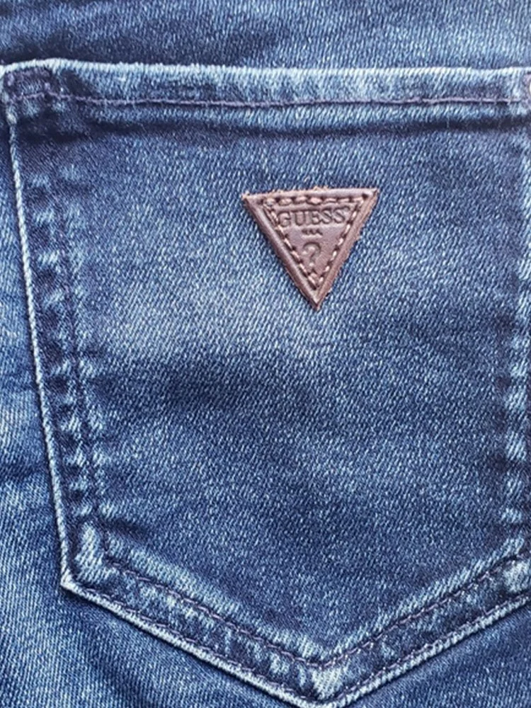 La silueta clásica de las bermudas recibe una actualización atrevida con este par de jean de Guess, diseñado con rotos de gran tamaño y un dobladillo sin rematar y desigual.