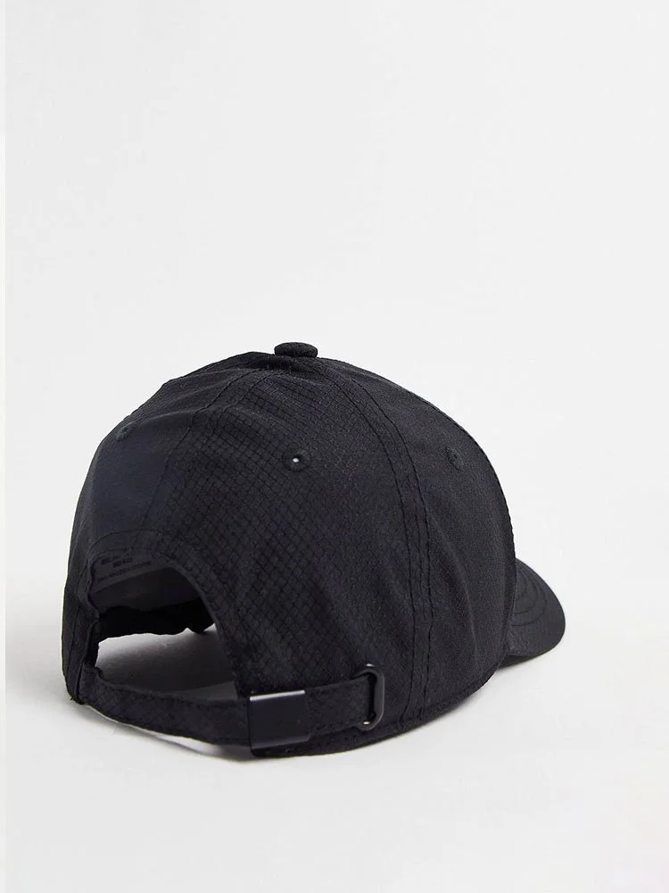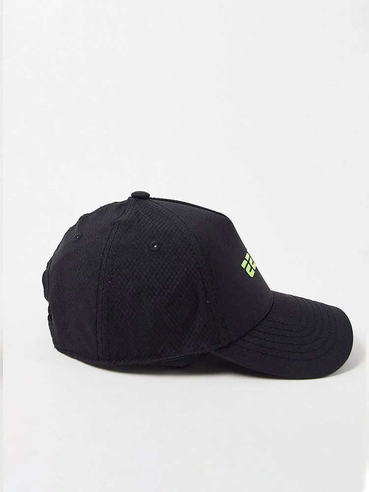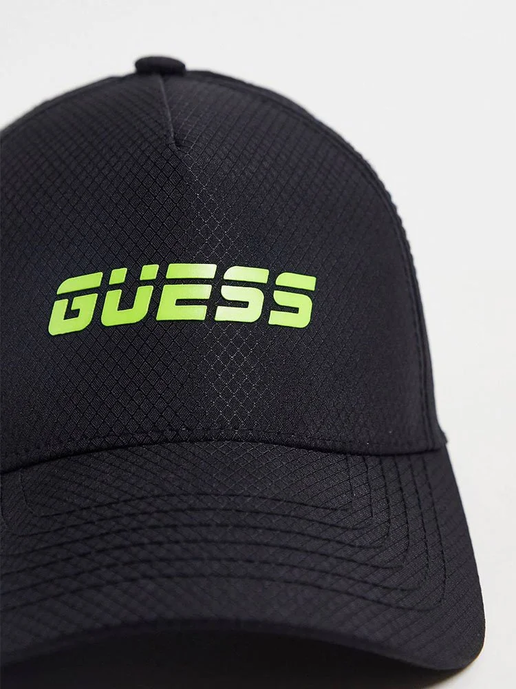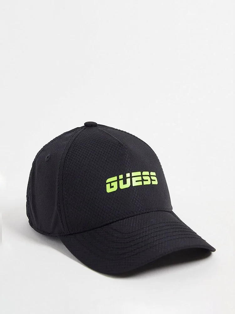Gorra de la marca Guess con corona de paneles, aberturas con ojales transpirables, visera curva y detalle de logotipo estampado. Correa trasera ajustable.