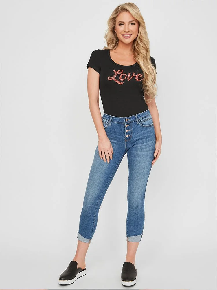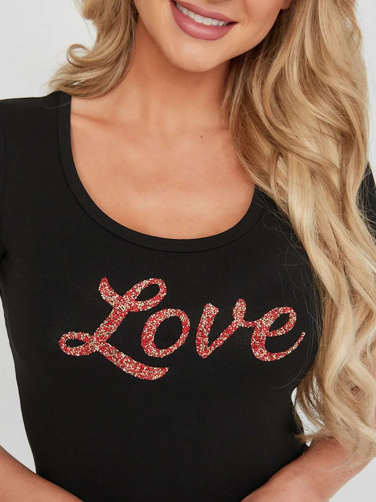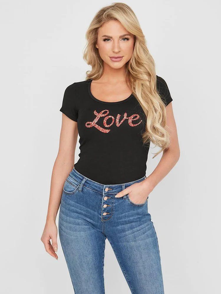 Comparta el amor cuando use esta camiseta de manga corta con escote redondo y un diseño de texto LOVE en pedrería en la parte delantera.