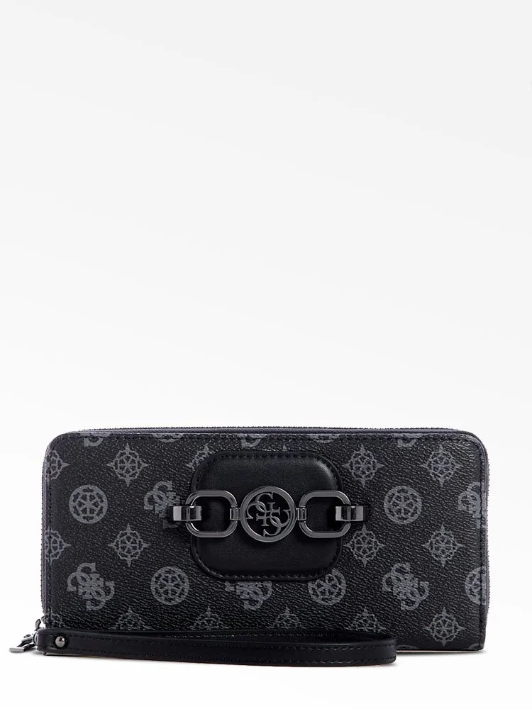 Mantenga su estilo elegante hasta el último detalle con esta billetera de piel sintética suave que presenta un detalle de parche en relieve con herrajes con el logotipo, una correa para la muñeca y un cierre con cremallera alrededor.