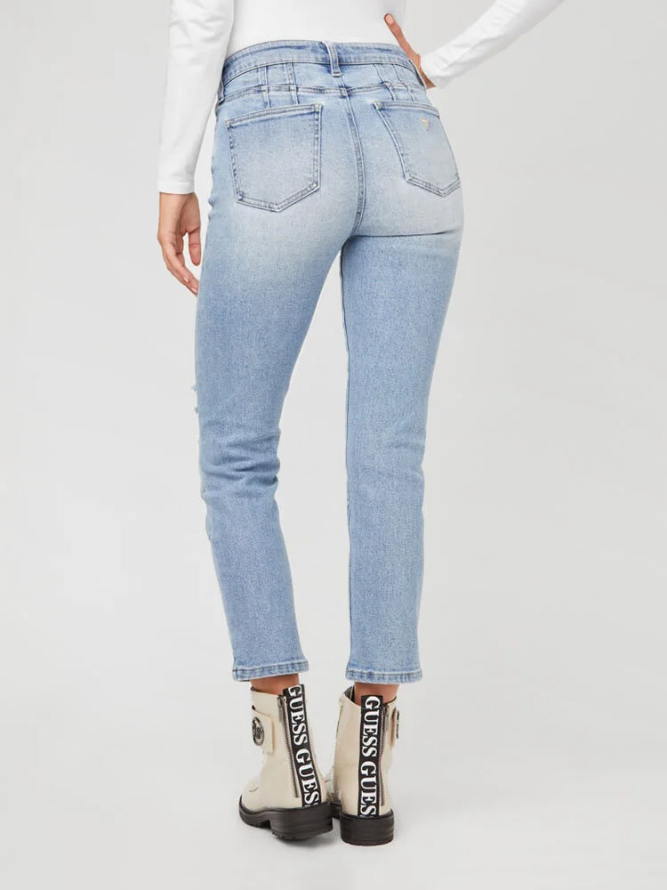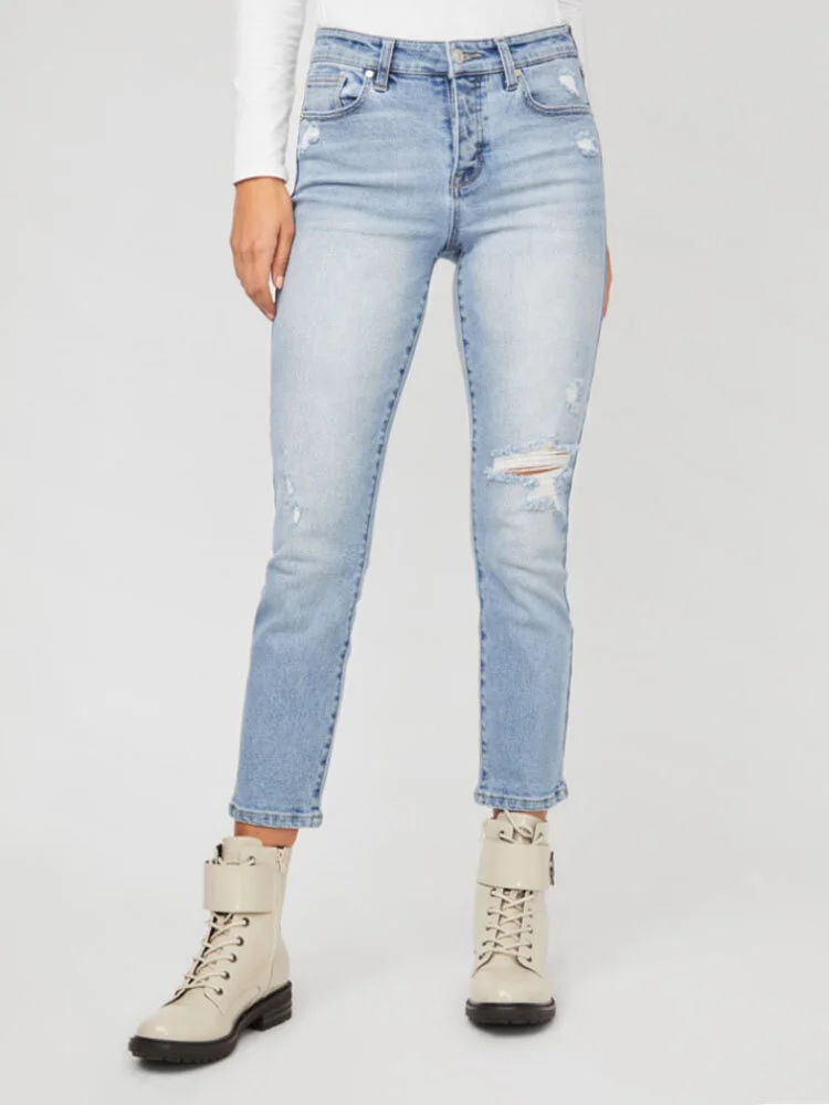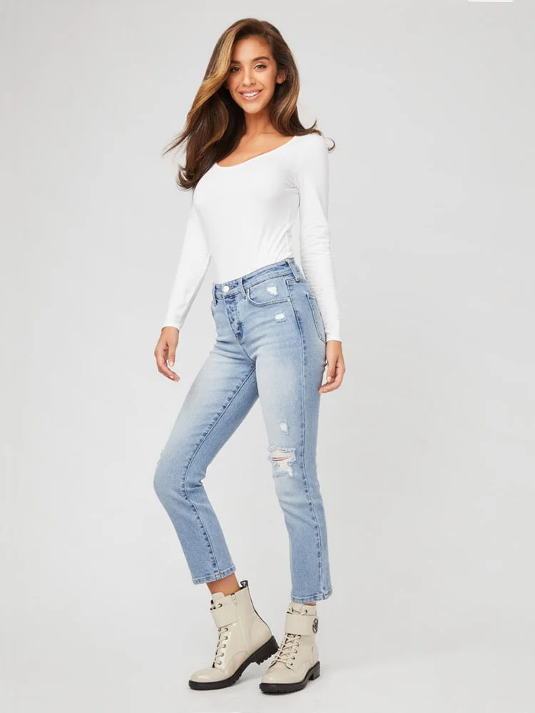 Diseñados con un ajuste ultra favorecedor, estos jeans tienen una cintura de altura media y pierna recta con tobillo corto.
