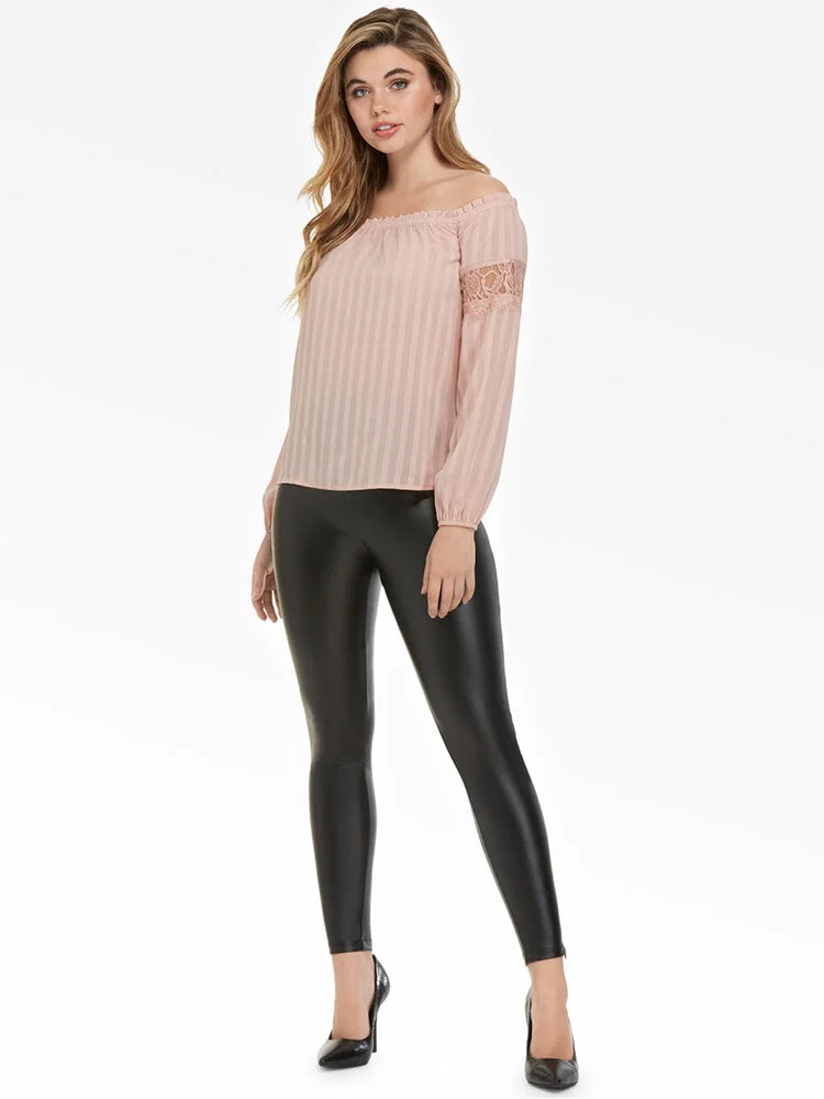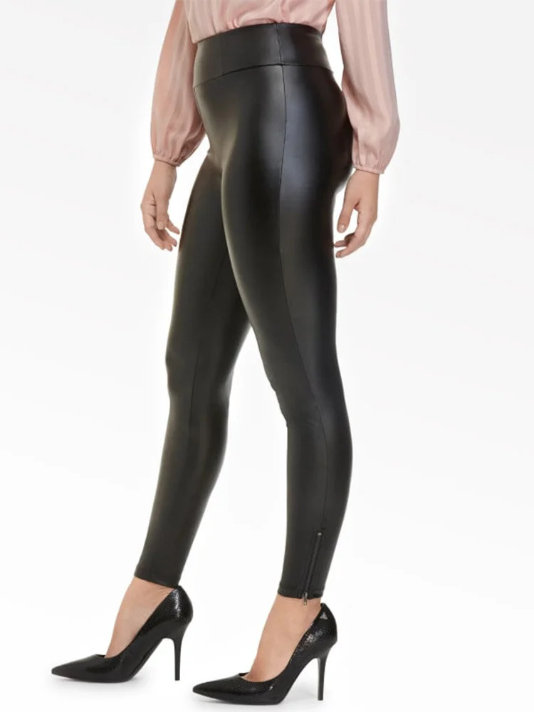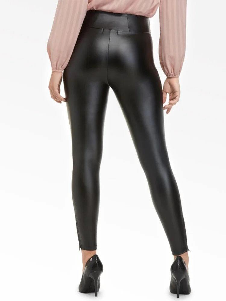 Dale un toque actualizado a cualquier look con estos leggings de cuerina. Estilo sin cordones, ni cierres, con corte de cintura alta. Traen incorporados cierres en ambos lados en la altura de los tobillos.